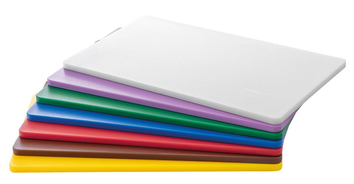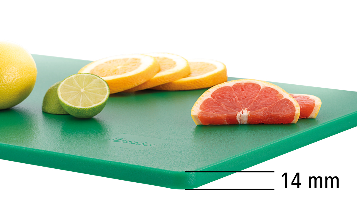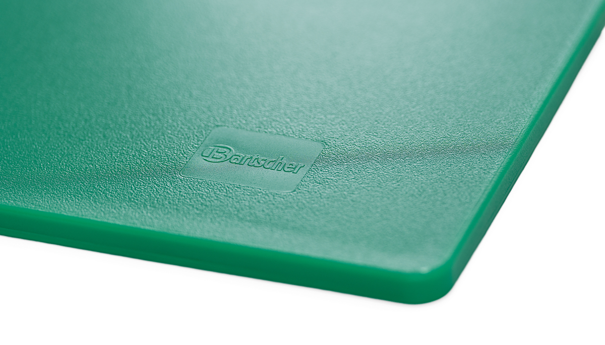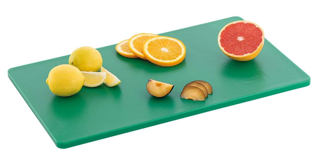 Hygiene im Fokus mit den Schneidbrettern im Format 53 × 32 cm - Verschiedenfarbige Schneidbretter für unterschiedliche Lebensmittelgruppen. Das beidseitig nutzbare, HACCP-konforme Schneidbrett in grün - für Obst und Gemüse - überzeugt durch seine Langlebigkeit.