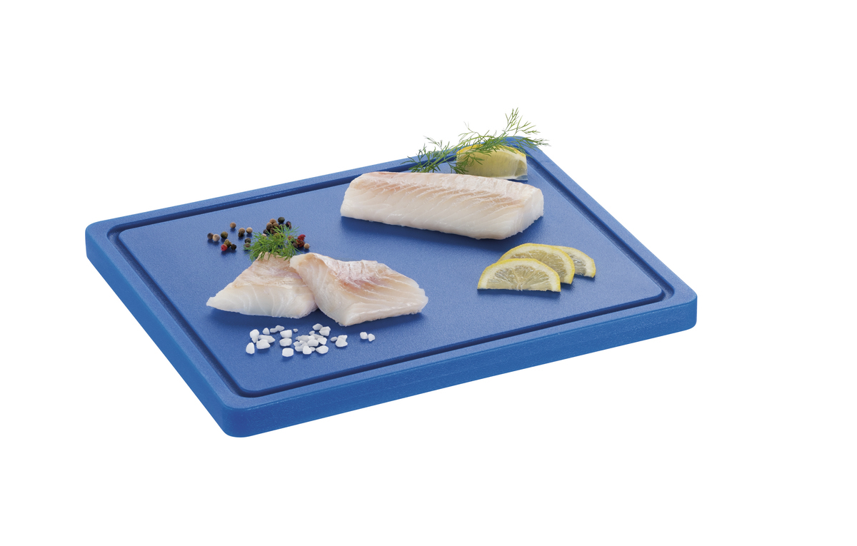Hygiene im Fokus mit der Schneidbrett-Serie PRO im Format 32 x 26 cm - Verschiedenfarbige Schneidbretter für die unterschiedlichen Lebensmittelgruppen. Das HACCP-konforme blaue Schneidbrett ist ausgelegt für das Schneiden von Fisch.