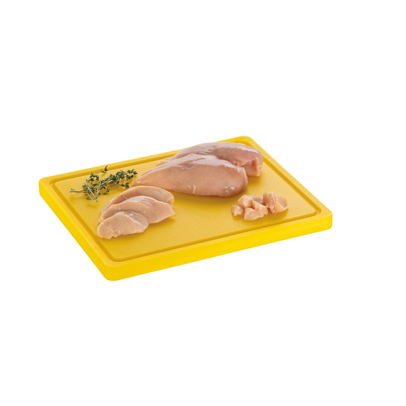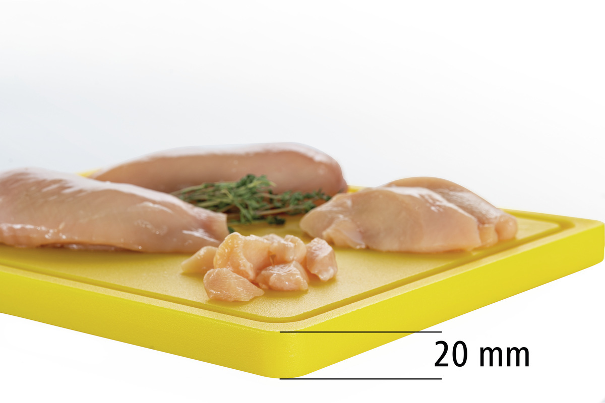 Hygiene im Fokus mit der Schneidbrett-Serie PRO im Format 32 x 26 cm - Verschiedenfarbige Schneidbretter für die unterschiedlichen Lebensmittelgruppen. Das HACCP-konforme gelbe Schneidbrett ist ausgelegt für das Schneiden von Geflügel.