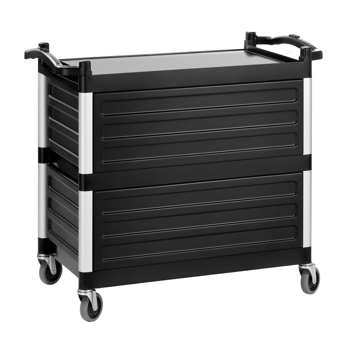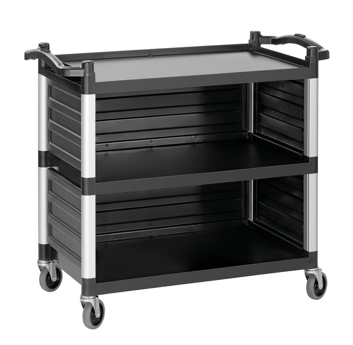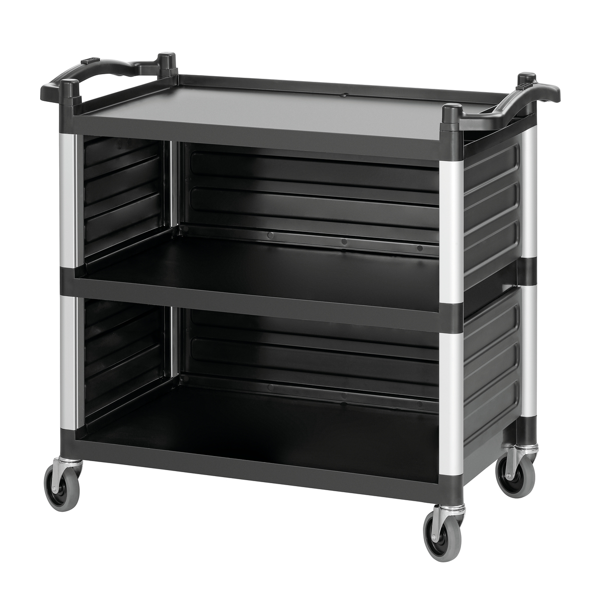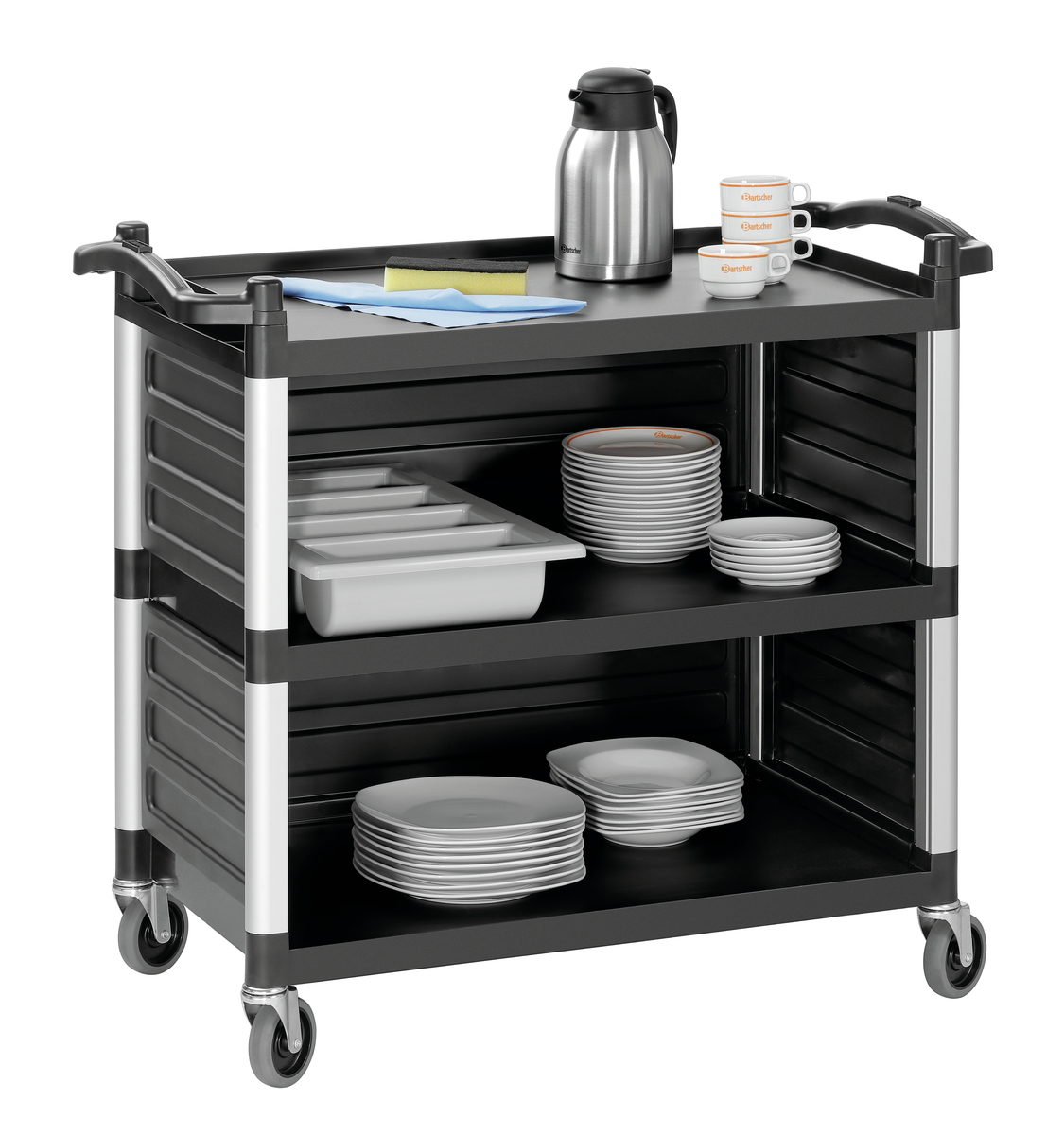 Mit seiner dreiseitigen Verkleidung verwehrt das leise laufende Leichtgewicht den Blick auf die Transportgüter wie beispielsweise dreckiges Geschirr. Der Servierwagen mit 3 Borden findet beim Servieren, Abräumen und Transportieren vielseitige Einsatzmöglichkeiten.