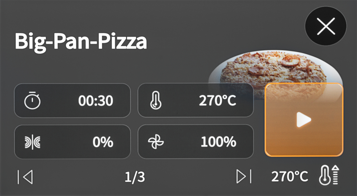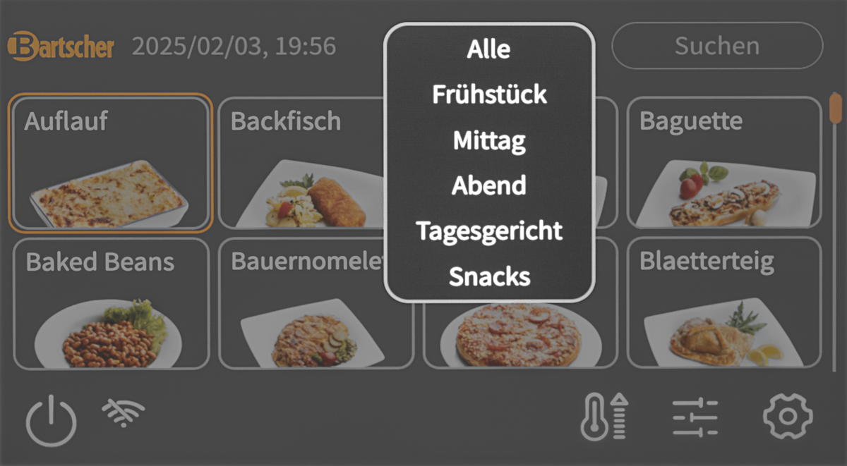 - Display-Anzeige: 8 Rezepte je Bildschirm-Anzeige ,Farbdisplay, 7 Zoll ,Mit Touch-Twist-Control ,Kapazitiv ,Programme (inkl. Bild), Programmfortschritt, Ist-/Vorheiztemperatur, Zeit