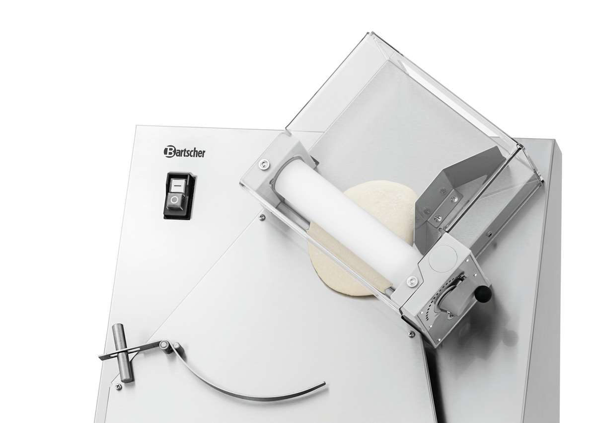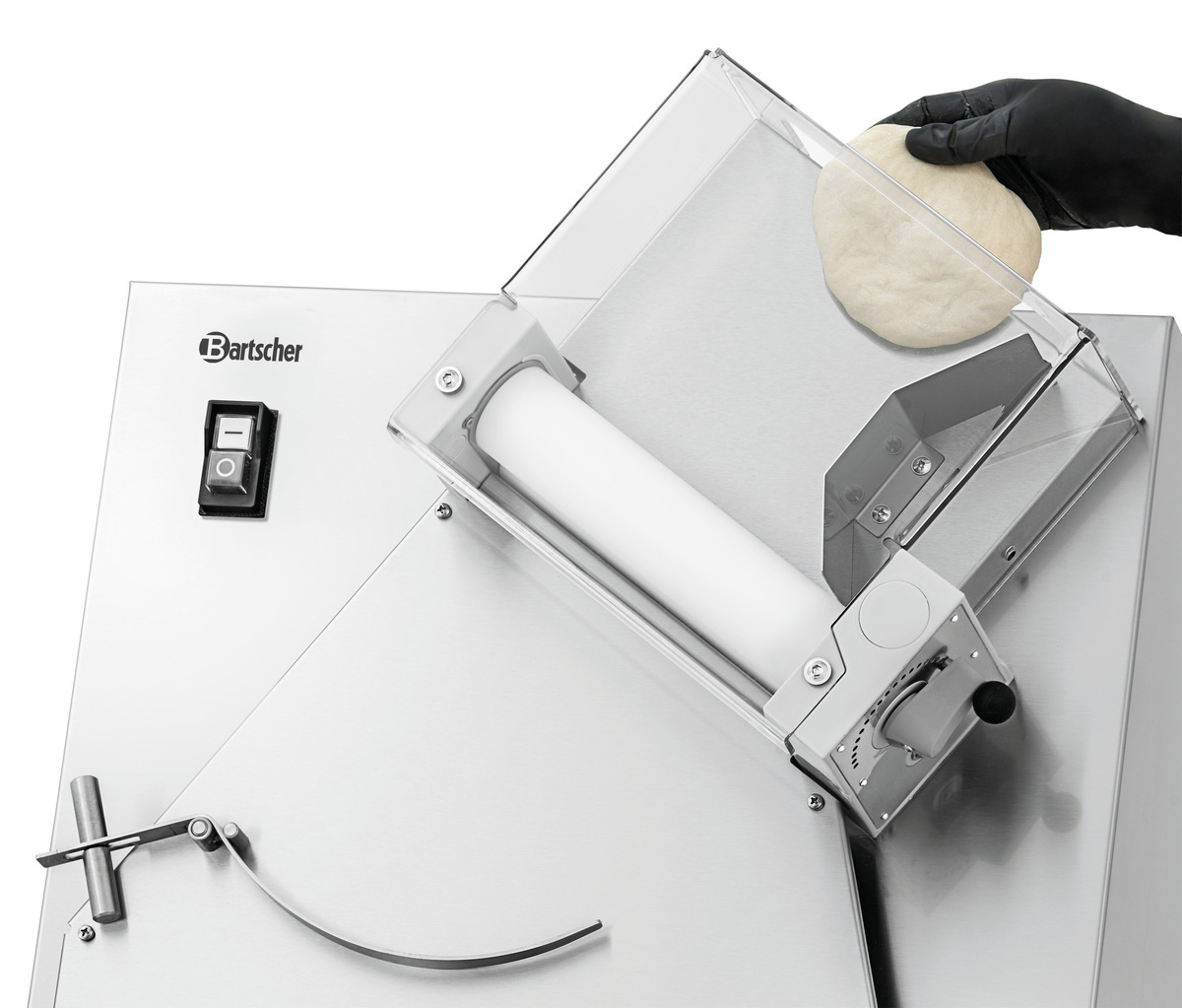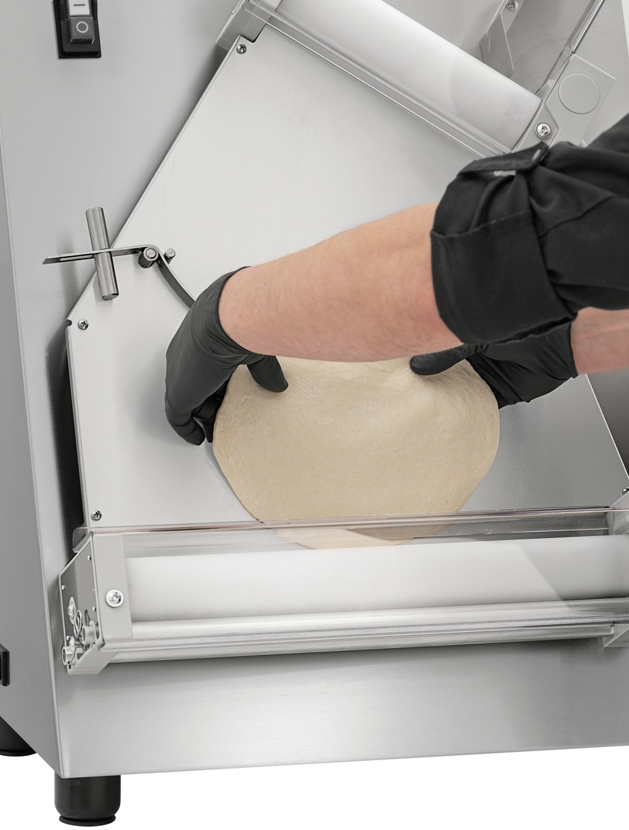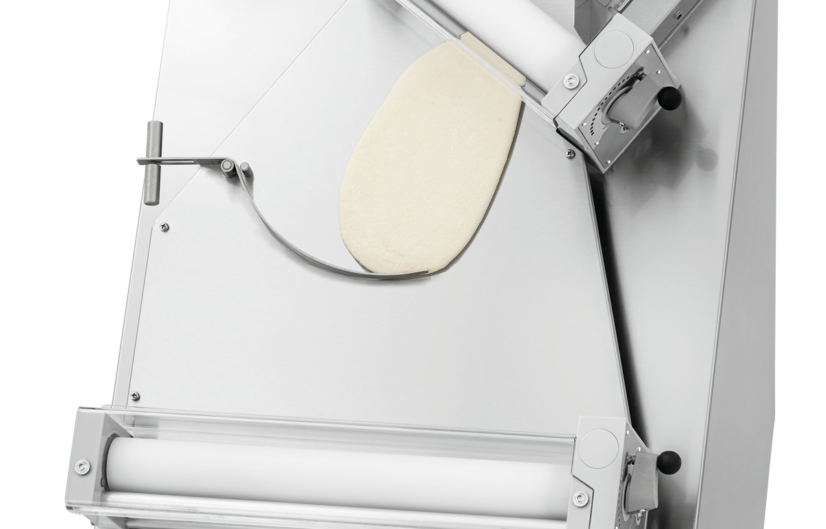 Für ein perfektes Ergebnis bei minimalem Arbeits- und Zeitaufwand - mit der Teigausrollmaschine gelingen Teige mit einem Durchmesser von bis zu 300 mm im Handumdrehen. Die vielseitige Produktion von Flammkuchen-, über Pizza- bis hin zu Fladenbrotteig ist ganz einfach über die Teigstärkeneinstellung der beiden Teigrollen möglich.
