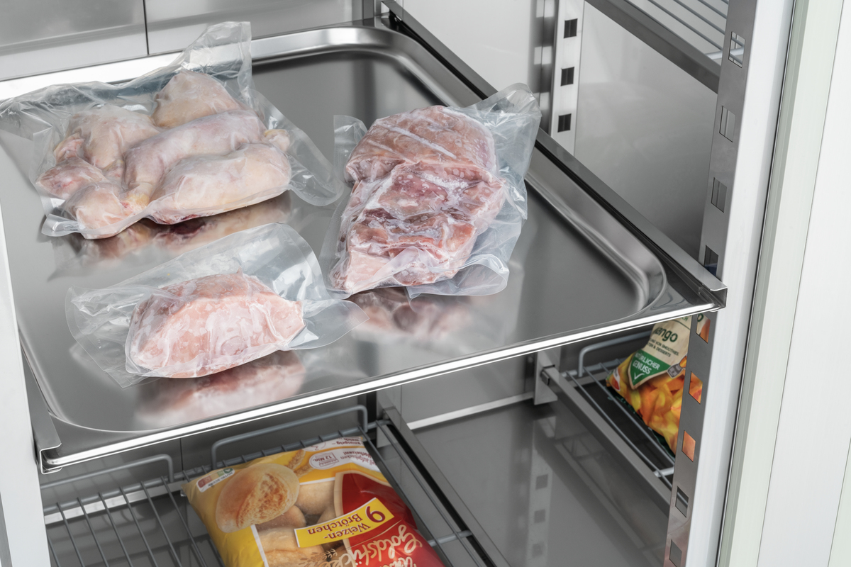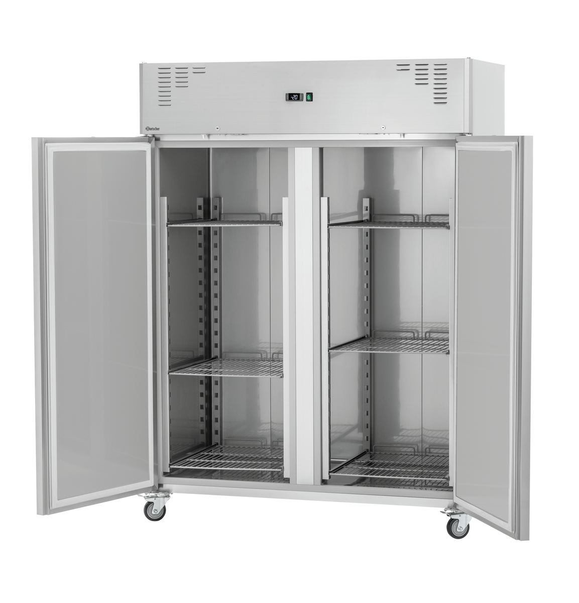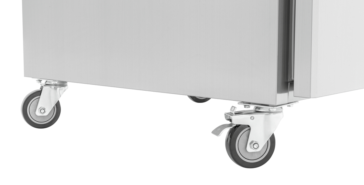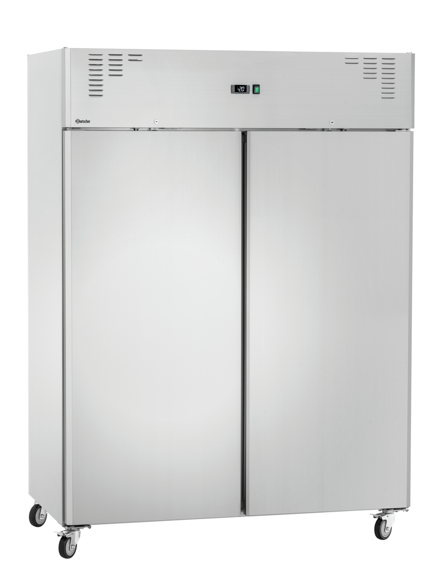 Darf es etwas mehr sein? Der doppeltürige Tiefkühlschrank bietet mit seinen Zwischenablagen im 2/1 GN-Format ein besonders großes Platzangebot für die Lagerung von Tiefkühlwaren. Die leistungsstarke Umluftkühlung trotzt der Größe und sorgt im Innenraum für eine gleichmäßige und konstante Temperatur.