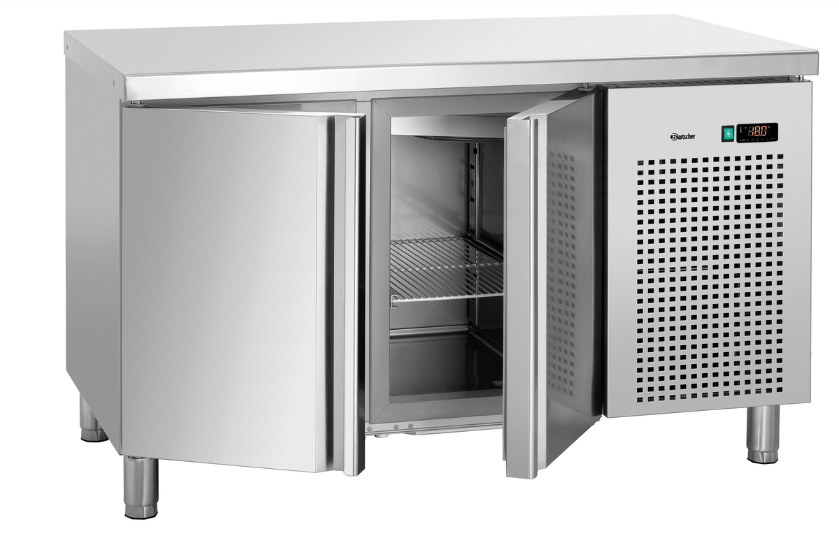 Der 2-türige Tiefkühltisch mit hochwertiger Edelstahl-Arbeitsfläche bietet geräumigen und leicht zugängigen Platz für Tiefkühlwaren. Dank der Umluftkühlung hält er konstant und gleichmäßig die Temperatur - ein zuverlässiger Partner in der Küche.