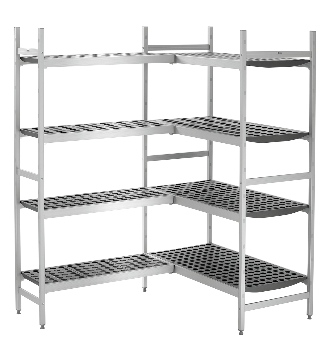 Mit Hilfe der Verbindungsleisten können 360 mm tiefe Regale mit weiteren Regalelementen zur Eckaufstellung verbunden werden. Die Aufstellung im 90 Grad-Winkel ermöglicht eine flexible, organisierte und platzsparende Erweiterung von Lagerflächen im Gastronomiebereich.