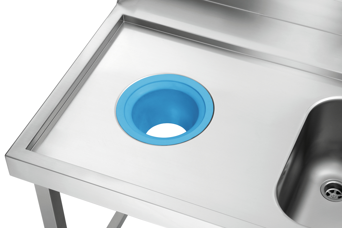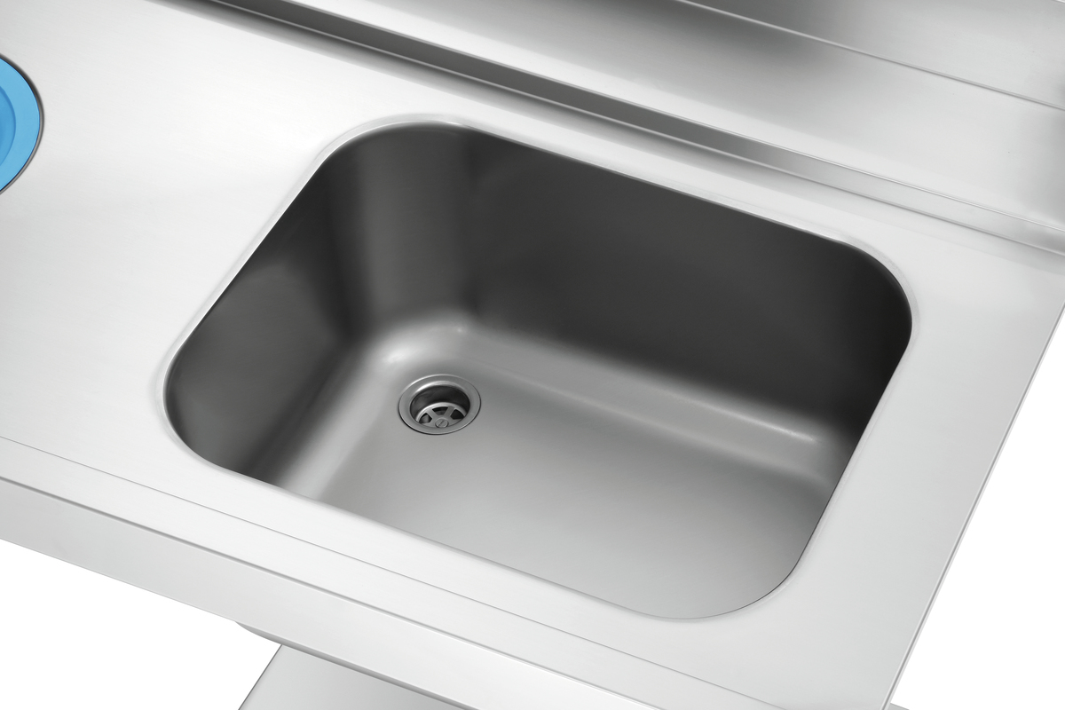 Die 1,2 m breite Vorabräumung mit Spüle und Abfallschacht ist ausgelegt für den linksseitigen Anbau an die Bartscher Durchschubspülmaschinen DS. Ein Grundboden bietet Abstellfläche für Spülkörbe.