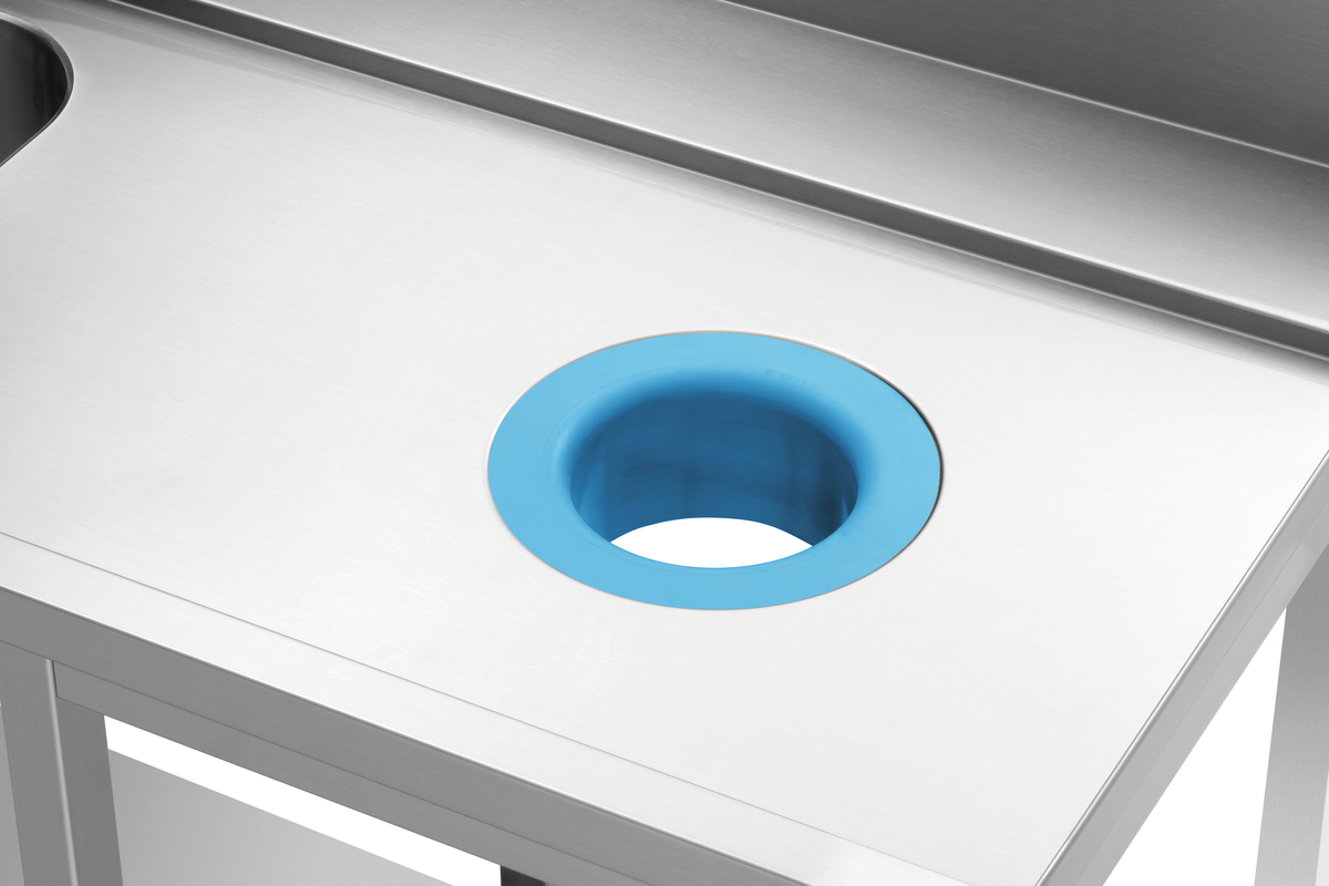Vorabräumung mit Spüle und Abfallschacht passend zur Korbtransportspülmaschine KTS5000 für perfekt vorgereinigtes Geschirr, Tabletts oder Backbleche. Der Grundboden unterhalb der Spüle bietet Platz für die Lagerung von Spülkörben, Tablettkörben, Besteckköchern etc.