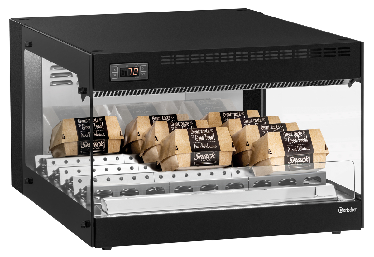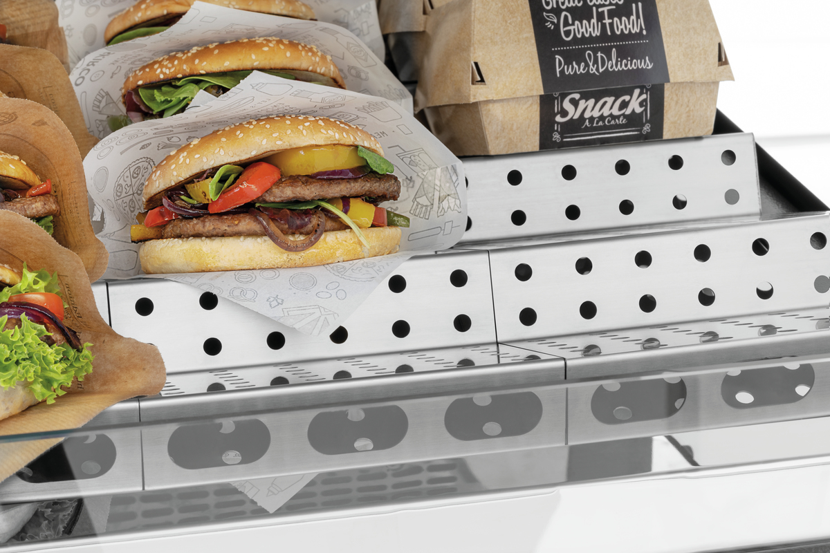 Der Gamechanger für die Stoßzeiten im Snackgeschäft - mit der Warmhaltevitrine werden vorbereitete Snacks warm gehalten und lassen sich leicht entnehmen. Durch die LED Beleuchtung sind warme Snacks für den Kunden verkaufsfördernd in Szene gesetzt.