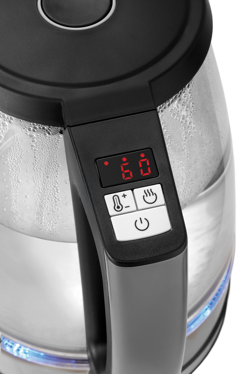 Mit seinem ansprechendem Design aus Glas und blauer Bodenbeleuchtung überzeugt der Wasserkocher nicht nur optisch. Leistungsstark, mit Display, diversen Temperaturstufen und Warmhaltefunktion lässt er auch technisch keine Wünsche offen.