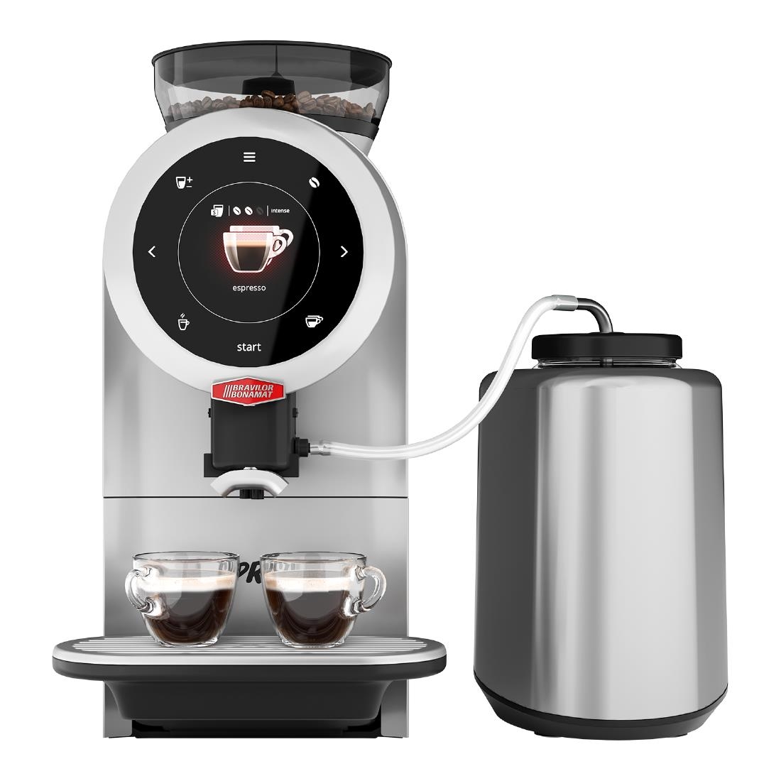 Um eine Auswahl an Kaffeespezialitäten mit frisch aufgeschäumter Milch zu genießen, sollten Sie den optionalen Sprso-Milchkühler in Betracht ziehen.