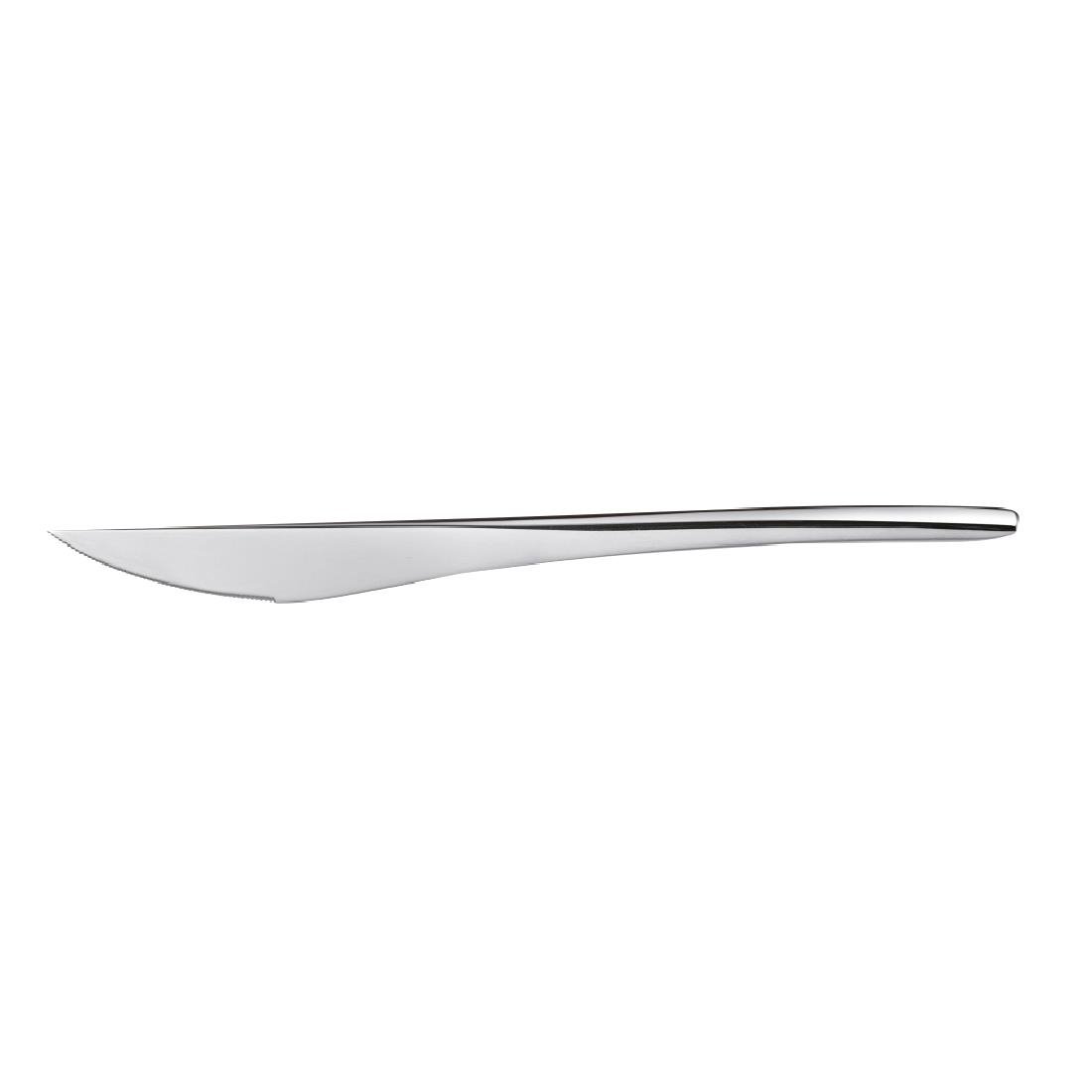 Mit seinem flachen Griff und der Klinge, die senkrecht zum Tisch steht, bietet das Comas Barcelona Steakmesser aus poliertem Edelstahl Balance, Funktionalität und Eleganz für Ihren Tisch.