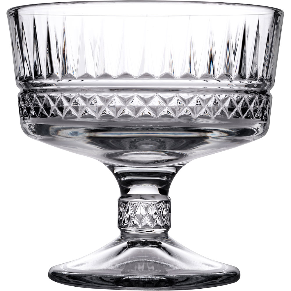 Die Dessertschale der Serie Elysia ist das ideale Glasgeschirr für gehobene Ansprüche.Der Bleikristallglas-Charakter mit dem dekorativen Reliefdekor setzt Ihre Desserts optimal in Szene.Für das einfache Handling können Sie das Glas in der Spülmaschine reinigen.