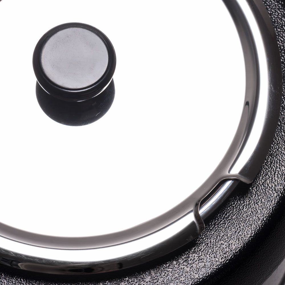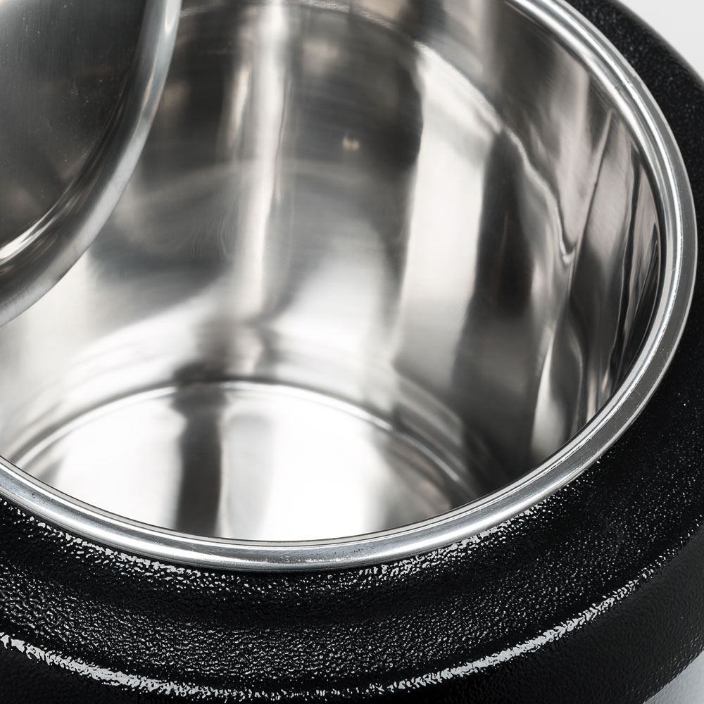 Der schwarze Suppentopf reiht sich gut auf Ihrem Buffet oder Bankett und ist bestens geeignet für Suppen, Eintöpfe oder Saucen. Sie füllen Ihre Speisen direkt in den Innenbehälter aus Edelstahl mit einer Füllmenge von 9 Litern.Bevor Sie den Edelstahlbehälter einsetzen, füllen Sie den Suppentopf idealerweise mit heißem Wasser, um die Aufwärmphase zu verkürzen. Der Wassermantel umgibt den Innenbehälter, damit Ihre Speise gleichmäßig warmgehalten wird.Über das übersichtliche Display stellen Sie gradgenau die optimale Warmhaltetemperatur zwischen 65°C und 95°C ein.Zur einfachen Entnahme des Einsatzes wird der Deckel mit der praktischen Aussparung für den Servierlöffel nur hochgeklappt. Zur Reinigung können Deckel und der Innentopf schnell entnommen werden.