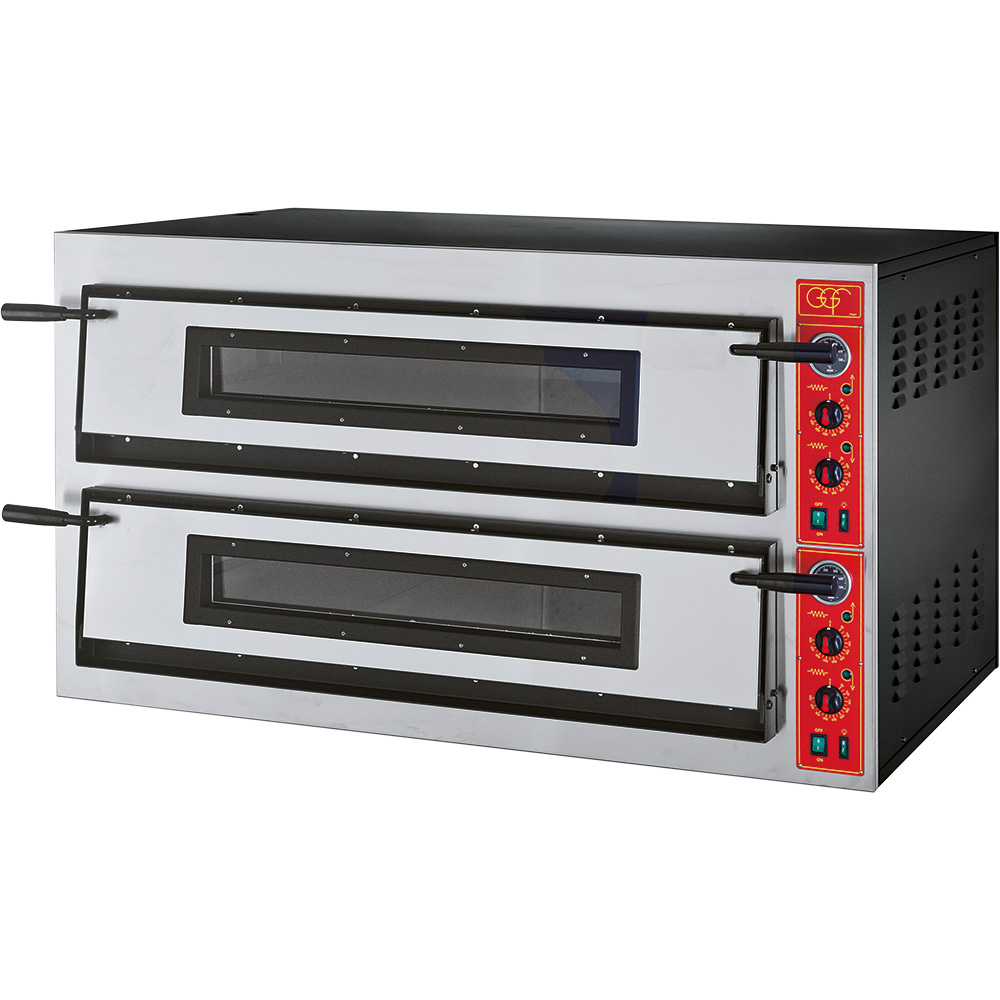 Der solide konstruierte Pizzaofen der Serie Professional Extra Power mit zwei übereinander angeordneten Kammern wurde unter Verwendung hochwertiger Komponenten gebaut und ist für den professionellen Gebrauch prädestiniert. Die besondere Stärke dieses Gerätes ist die Ausstattung der Backkammer mit Vollschamotte. So wird die Hitze von allen Seiten und gleichmäßig an Ihr Backgut weitergegeben. Zudem speichert der Schamottestein die Wärme über einen längeren Zeitraum und nimmt auch Feuchtigkeit auf. So gelingen Pizza und Brot besonders knusprig. Das kompakte, hervorragend isolierte Gehäuse aus pulverbeschichtetem Stahl hat ein Frontpaneel mit scharnierten Ofenklappen aus Edelstahl. Sie können bis zu 12 Pizzen mit einem Durchmesser von 36 cm gleichzeitig backen. Aber auch für Baguette, Quiches oder andere Backwaren ist der Ofen vielseitig im Einsatz. Die Kammern verfügen über eine Beleuchtung, damit Sie die Backräume gut einsehen können. Die leistungsstarken Backöfen mit insgesamt 18 kW heizen zügig bis zu einer Temperatur von 500 Grad auf, Ober- und Unterhitze sind je nach Bedarf unabhängig voneinander steuerbar.