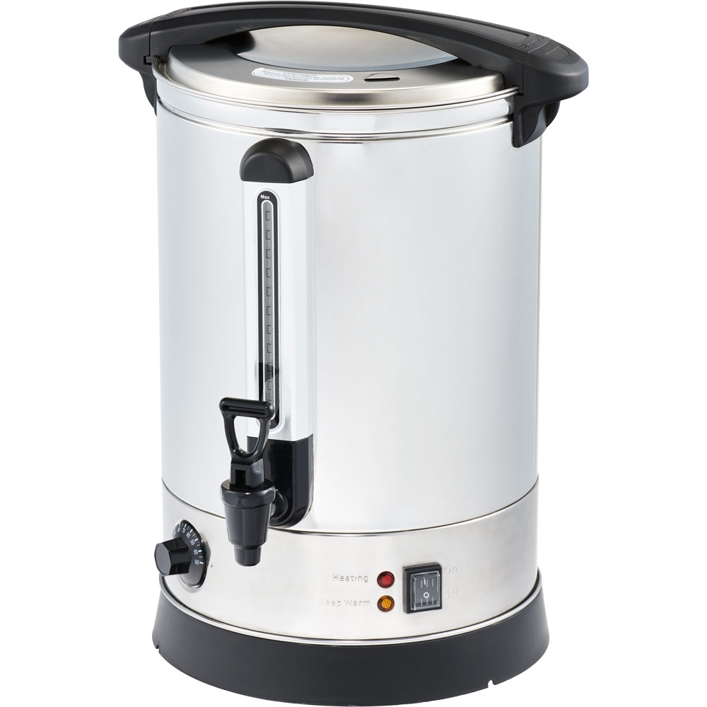 Der Heißwasserkocher verfügt über eine präzise Temperatureinstellung von 30 bis 110 Grad Celsius, eine übersichtliche Füllstandsanzeige und einen tropffreien Ablasshahn. Durch den sicher verschließenden Deckel mit isoliertem Griff ist das Gerät einfach und sicher in der Handhabung.Der Heißwasserspender ist ein unverzichtbarer Partner für das Catering, auf dem Buffet und ist auch besonders empfehlenswert für Verkaufsstände mit Glühwein- oder Teeausschank.