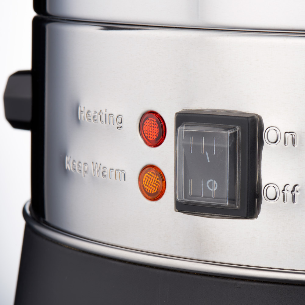 Der Heißwasserkocher verfügt über eine präzise Temperatureinstellung von 30 bis 110 Grad Celsius, eine übersichtliche Füllstandsanzeige und einen tropffreien Ablasshahn. Durch den sicher verschließenden Deckel mit isoliertem Griff ist das Gerät einfach und sicher in der Handhabung.Der Heißwasserspender ist ein unverzichtbarer Partner für das Catering, auf dem Buffet und ist auch besonders empfehlenswert für Verkaufsstände mit Glühwein- oder Teeausschank.