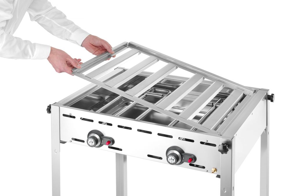 - Das erhöhte Gitter hält Saucen und fertige Gerichte warm, während das Kochen fortgesetzt wird.