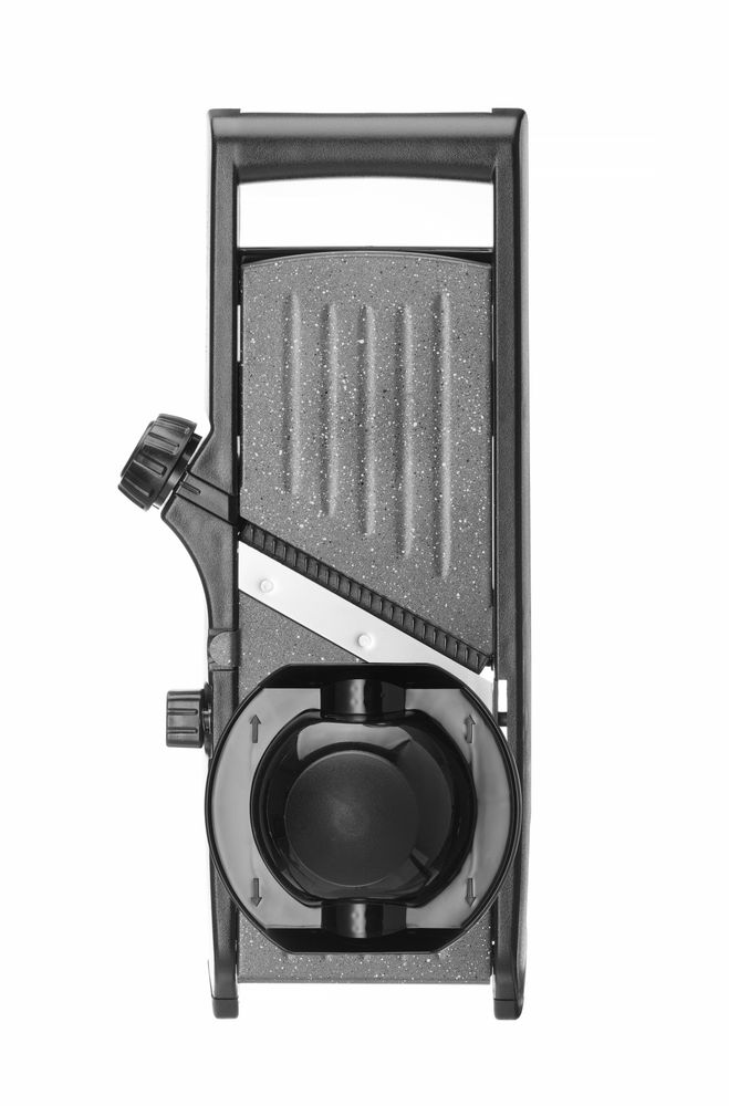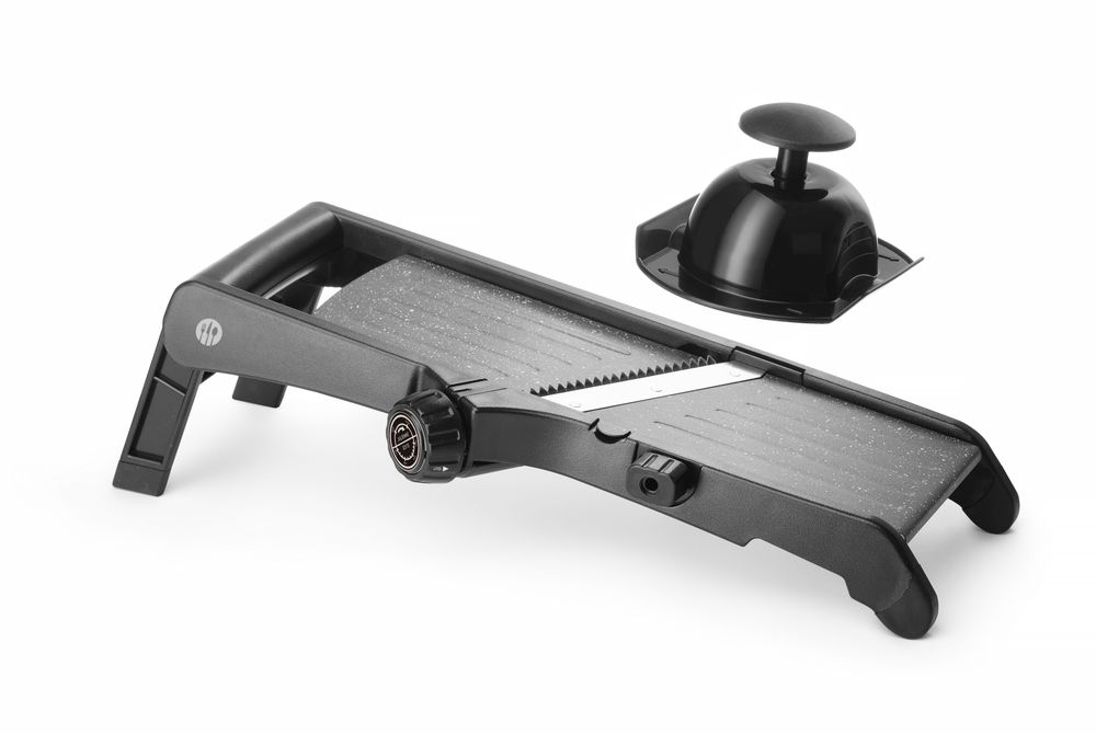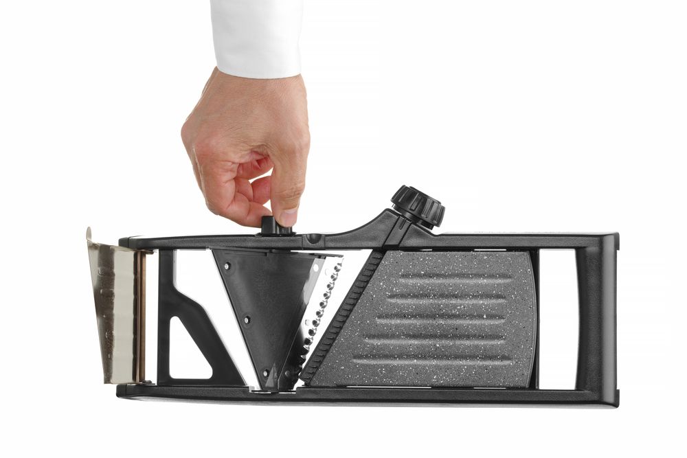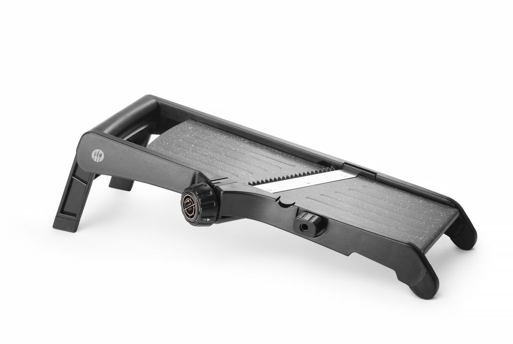 Robuste Konstruktionsweise aus Edelstahl, ABS und Polypropylen.Die Oberfläche ist mit einer PTFE-Antihaftbeschichtung für einfaches Schneiden versehen. Sehr scharfe Hauptklingen, einfaches Umschalten zwischen glatter und gewellter Klinge. Schnittdicke zwischen 1 und 9 mm einstellbar. Mit integrierten Klingen für 4,5 mm Julienne-Streifen und 9 mm dicke Pommes Frites. Möglichkeit, die Julienne-Klinge zur Reinigung der Mandoline zu entfernen, Entriegelungsposition auf dem Knopf aufgedruckt. Mit einklappbarem Standfuß und Schüsselhaken - kann freistehend, auf einer Schüssel oder sogar in der Hand verwendet werden. Schüsselhaken und einklappbare Füße sind mit rutschfestem TPR (thermoplastischem Gummi) ummantelt, um eine verbesserte Stabilität während der Benutzung zu gewährleisten. Im Lieferumfang enthalten ist ein Fingerschutz und ein Klingenschutz für eine sichere Aufbewahrung.