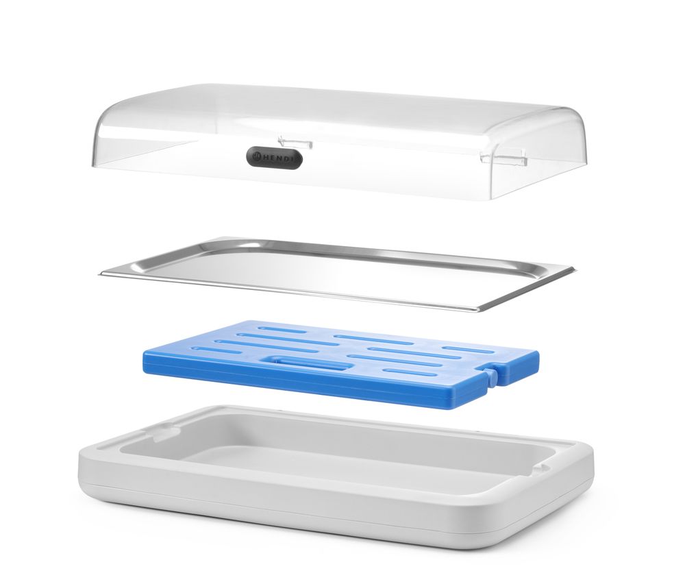 - Effektive Kühlung – Wird mit einem GN 1/1 Tablett und einem Kühlelement geliefert, um Lebensmittel länger frisch zu halten.