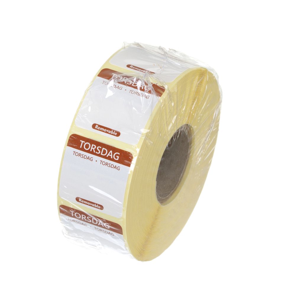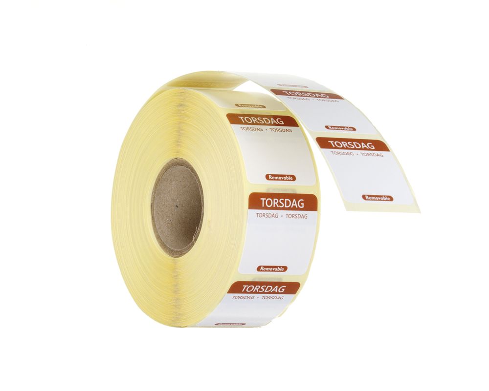 Platz für zusätzliche Notizen. Anzahl Aufkleber pro Rolle: 1000 Stk. Jeder Wochentag mit einer anderen Farbe. Etikett in 3 Sprachen: Dänisch, Norwegisch und Schwedisch.