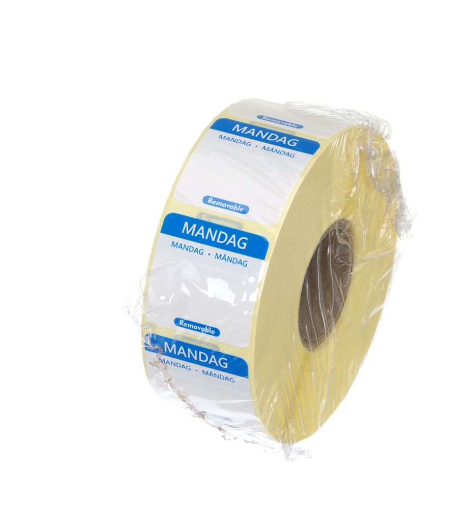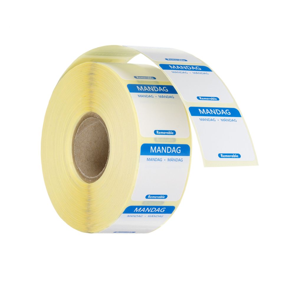 Platz für zusätzliche Notizen. Anzahl Aufkleber pro Rolle: 1000 Stk. Jeder Wochentag mit einer anderen Farbe. Etikett in 3 Sprachen: Dänisch, Norwegisch und Schwedisch.