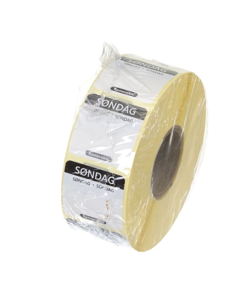 Platz für zusätzliche Notizen. Anzahl Aufkleber pro Rolle: 1000 Stk. Jeder Wochentag mit einer anderen Farbe. Etikett in 3 Sprachen: Dänisch, Norwegisch und Schwedisch.