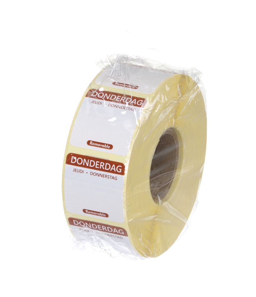 Platz für zusätzliche Notizen. Anzahl Aufkleber pro Rolle: 1000 Stk. Jeder Wochentag mit einer anderen Farbe. Etikett in 3 Sprachen: Niederländisch, Französisch und Deutsch.