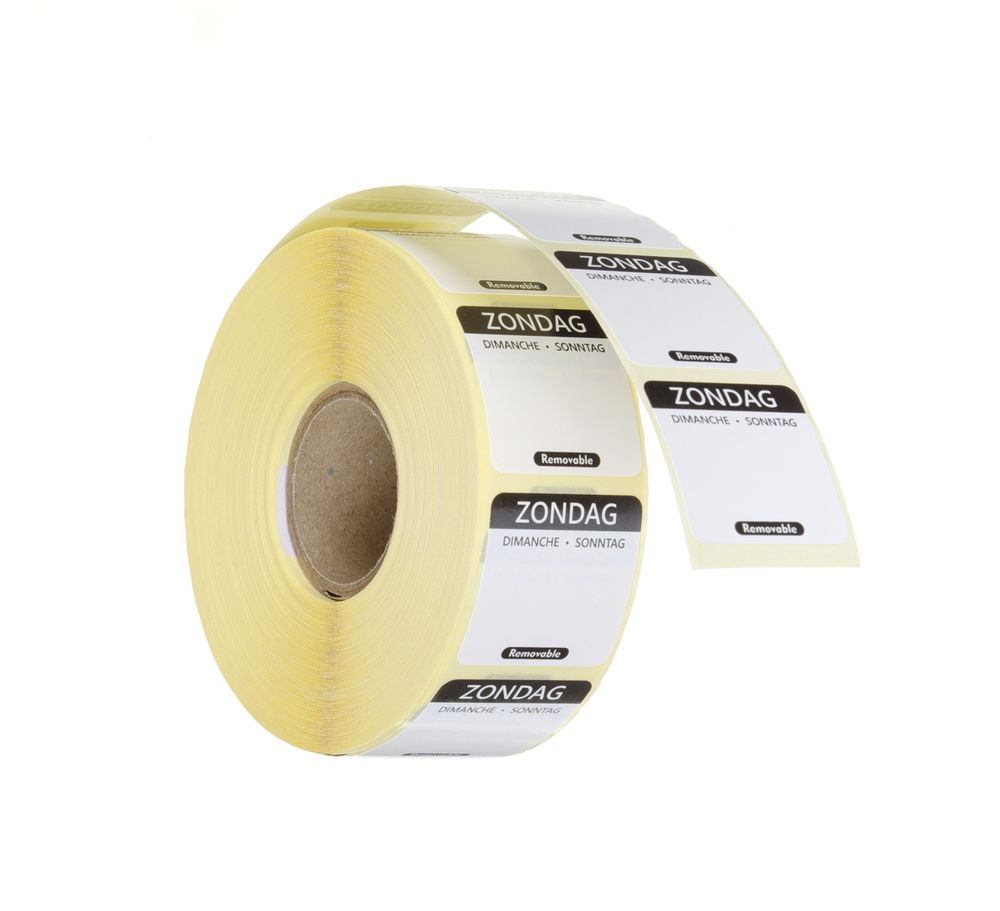 Platz für zusätzliche Notizen. Anzahl Aufkleber pro Rolle: 1000 Stk. Jeder Wochentag mit einer anderen Farbe. Etikett in 3 Sprachen: Niederländisch, Französisch und Deutsch.