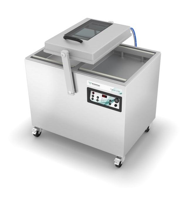 Die robuste Falcon 2-60 Vakuumverpackungsmaschine mit Aluminiumkammer und –deckel ist standardmäßig mit zwei Schweissleisten, einer Busch Vakuumpumpe und einer Digitalen Steuerung mit 10 Vorwahlprogramme ausgestattet. Dieses Doppelkammermaschine entspricht den CE-Normen.