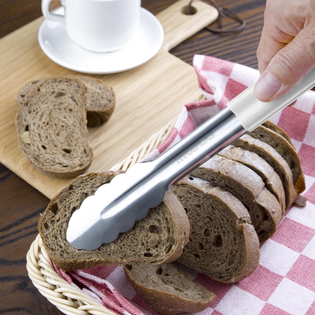 Vermeiden Sie Kreuzkontaminationen mit diesen farbkodierten Servierzangen aus Edelstahl. Die glatte Oberfläche verhindert Rückstände von Essensresten und Bakterien. Erhältlich in den Längen 30cm und 40,5cm.