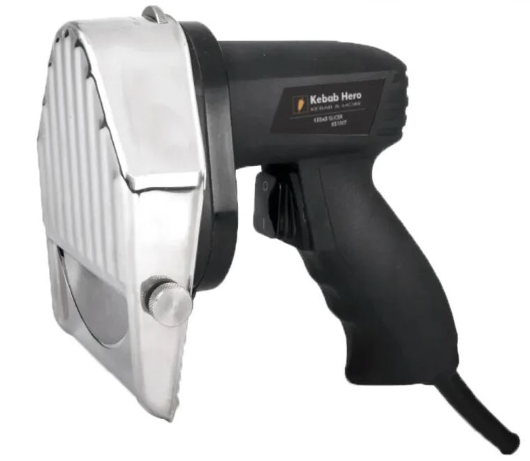 Das Kebab Hero® KS100T EcoLine Dönermesser mit ergonomischem Pistolengriff und 100mm Kreismesser Klinge eignet sich zum professionellen Schneiden von Gyros, Kebab, Döner, Hähnchendöner, Putendöner und Shoarma. Die beste Wahl bei einer täglichen Schneidekapazität bis zu 40 kg oder als kostengünstiges Zweitmesser. Das Kebab Hero® KS100T Dönermesser mit 80W ist eine kostengünstige Alternative zu den auf dem Markt bekannten elektrischen Dönerschneidern.
