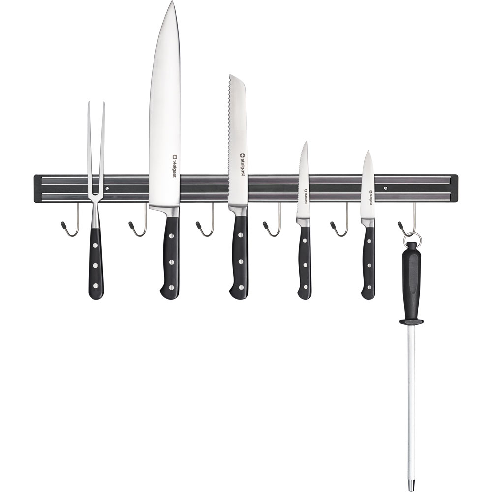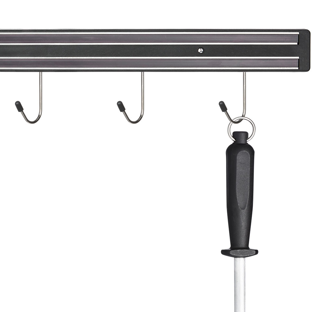 Alles läuft glatter, wenn die Küchenutensilien einen festen Platz haben.Darum verwahren Sie Ihre Messer griffbereit und Klingen schonend, aber dennoch sicher mit dem magnetischen Messerhalter.Die zwei starken Magnete halten auch schwere Messer zuverlässig an ihrem Platz. Die fünf Haken bieten zusätzliche Verwahrungsmöglichkeiten für Ihr Equipment!