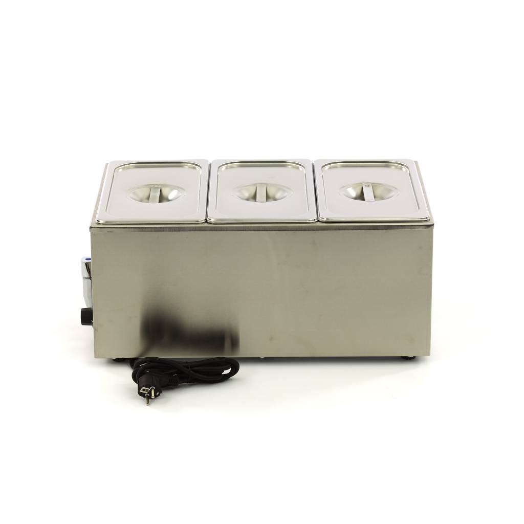 Für das allmähliche Erwärmen oder Zubereiten von Speisen ist diese Bain-Marie ideal. Es wurde komplett aus Edelstahl gefertigt und ist für die Verwendung mit GN-Behältern geeignet. Diese Bain-Marie wird mit einem praktischen Ablasshahn zum einfachen Entleeren des Behälters und drei 1/3GN-Behältern mit Deckeln geliefert.