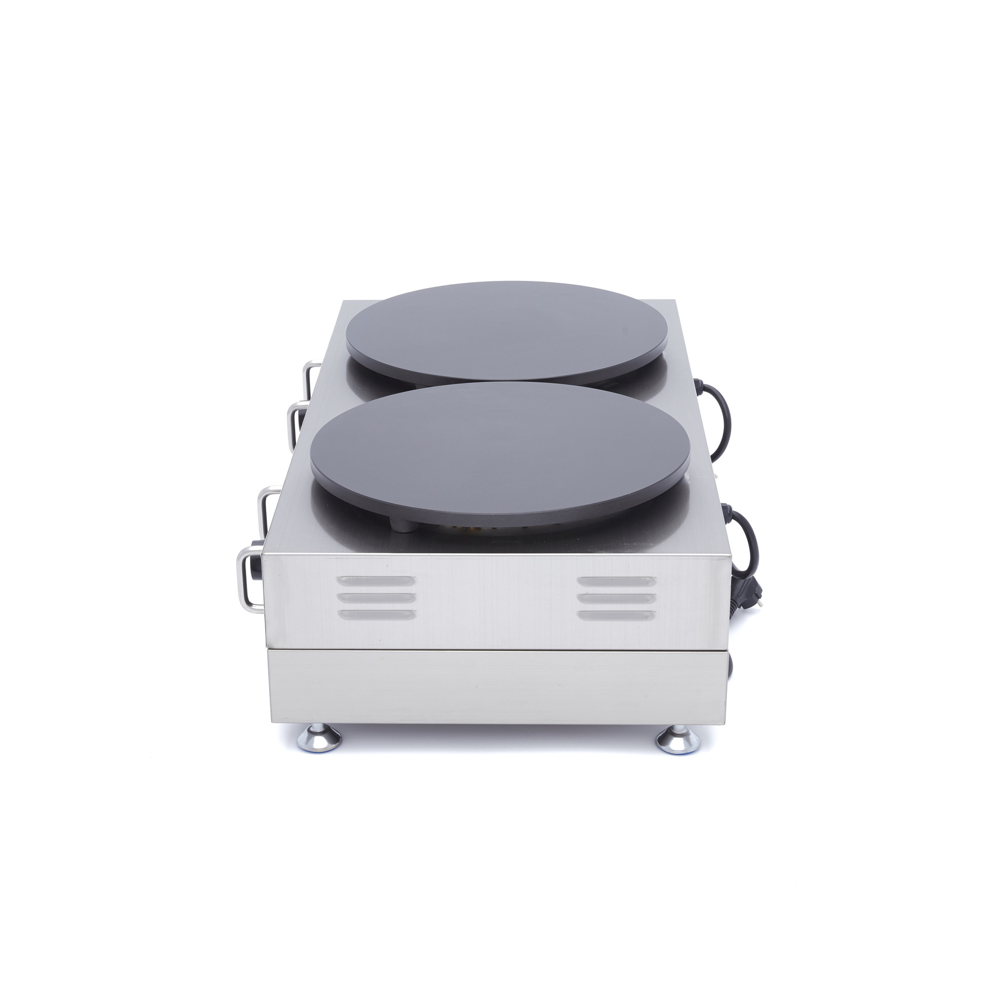 Mit diesem doppelten elektrischen Crêpe-Maker können Sie schnell und einfach große Portionen Crêpes zubereiten. Dank der einfachen Bedienung und der kompakten Größe können diese dünnen französischen Pfannkuchen an jedem Ort zubereitet werden. Mit praktischer Schublade zur Aufbewahrung der Crepes bis zum Servieren.Mit diesem doppelten elektrischen Crêpe-Maker können Sie die leckersten Crêpes, dünne französische Pfannkuchen, herstellen. Frische hausgemachte Crêpes sind ideal zum Frühstück, Mittagessen, Dessert oder als einfacher Snack. Die kompakte Größe sorgt dafür, dass Sie den Crêpe-Maker nicht nur in Ihrer Catering-Küche, sondern auch in einem Kuchenstand, Foodtruck oder an einem Marktstand bei Veranstaltungen einsetzen können. Unter dem Crêpe-Backblech befindet sich eine Aufbewahrungsschublade, in der Sie die hergestellten Crêpes aufbewahren können. Das Backblech hat eine optimale Wärmeübertragung für die schnelle Herstellung großer Crepes-Portionen.