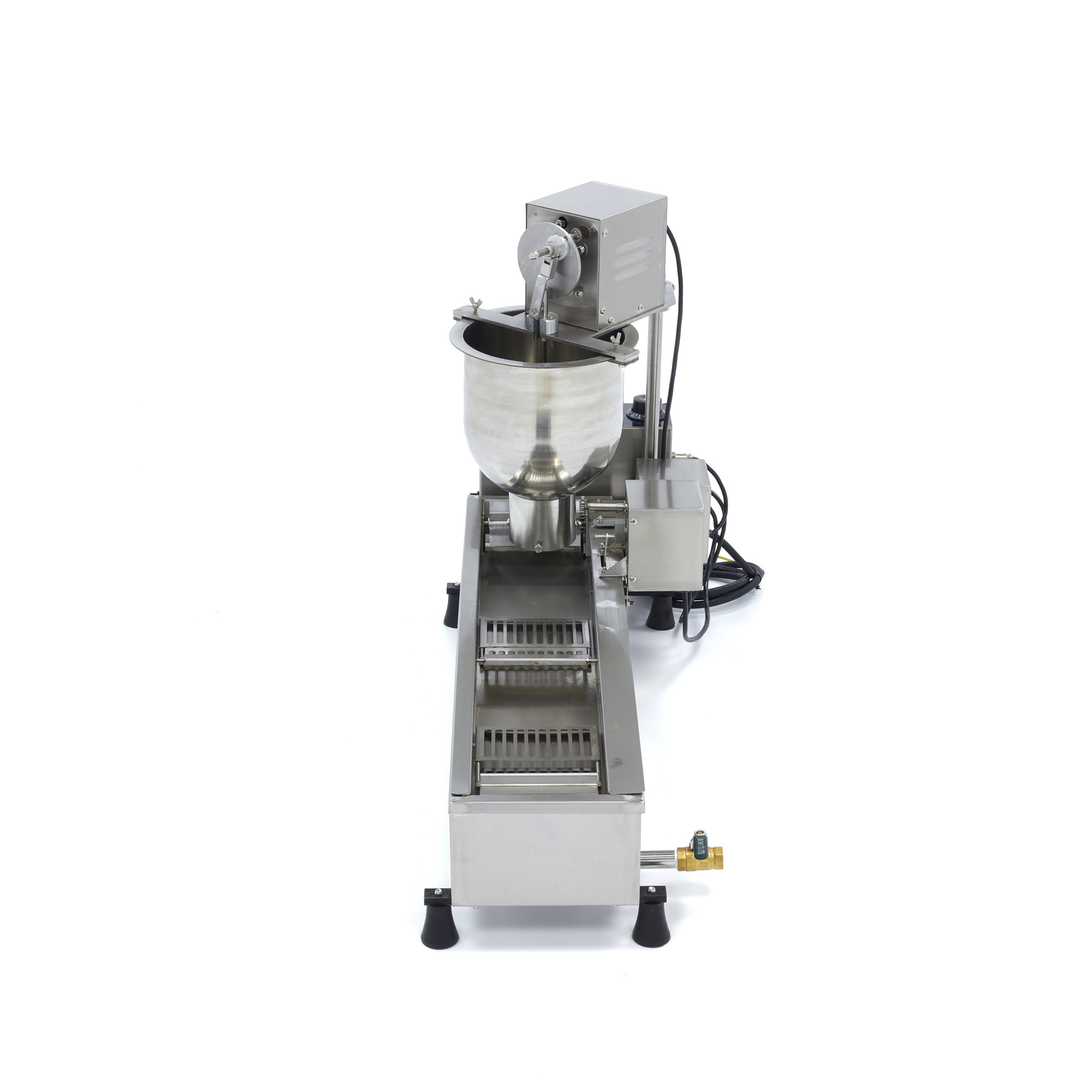 Mit dieser vollautomatischen Donut-Maschine mit Fritteuse können Sie bis zu 450 Donuts pro Stunde herstellen. Geben Sie den Teig in die Schüssel und ein Donut wird herauskommen. Die Donuts werden in der Fritteuse frittiert, und die beweglichen Gitter in der Frittierschale sorgen dafür, dass sich die Donuts drehen und gleichmäßig backen. Sie ist ideal für hohe Produktion und intensiven Gebrauch.