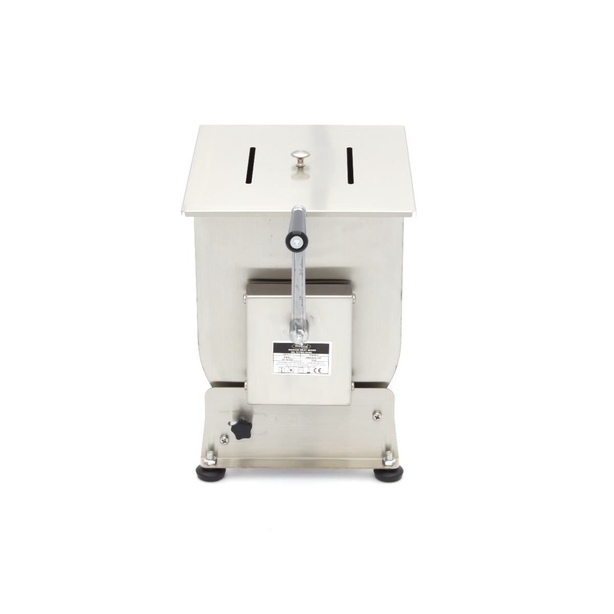 Kippbare Schüssel und praktischer DrehgriffDas Mischen von Fleisch in diesem Edelstahl-Fleischmixer ist ganz einfach: Öffnen Sie einfach den Deckel und füllen Sie den Behälter mit der gewünschten Menge Fleisch oder Fisch. Der Behälter hat ein Fassungsvermögen von 30 Litern und ist für die Verarbeitung von 20 bis 25 kg Fleisch oder Fisch geeignet. Nachdem Sie Ihr Fleisch eingefüllt haben, können Sie Gewürze wie Kräuter, Nüsse oder Gemüse hinzugeben. Um alles gut zu vermischen, drehen Sie den Griff, bis Sie die richtige Konsistenz für Ihr Fleisch oder Ihre Füllung erreicht haben. Der Fleischmixer kann sich in zwei Richtungen drehen. Der kippbare Behälter ist sehr praktisch, wenn Sie den Inhalt herausnehmen möchten, und bietet außerdem einen großen Vorteil bei der Reinigung. Für einen guten Halt auf fast jeder Oberfläche ist der Fleischmixer mit vier Gummifüßen ausgestattet.