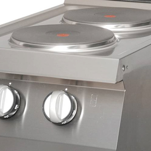 Dieser Elektro-Hochleistungsherd hat zwei Brenner und gusseiserne Topfträger. Er ist für den Einbau in eine 700-mm-Kochzeile geeignet und kann mit einem Ständer erweitert werden. Die Monoblockplatte und das Gehäuse aus Edelstahl machen die Reinigung einfach. Er ist mit praktischen Drehknöpfen für eine einfache Bedienung ausgestattet.