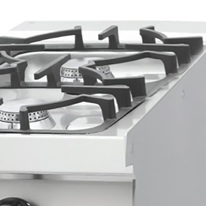 In großen und stark frequentierten Großküchen müssen die Kochgeräte robust und langlebig sein. Dieses zweiflammige Gaskochfeld wurde speziell für den intensiven täglichen Gebrauch entwickelt und ist ideal für Restaurants, Cafés, Hotels, Snackbars und andere Gastronomiebetriebe. Die robuste und äußerst langlebige Konstruktion besteht aus einem Gehäuse aus Edelstahl und schweren gusseisernen Pfannenträgern. Die strapazierfähigen Komponenten halten einer hohen Beanspruchung stand. Sie können das Kochfeld auch mit einem ebenfalls bestellbaren Edelstahlsockel erweitern.