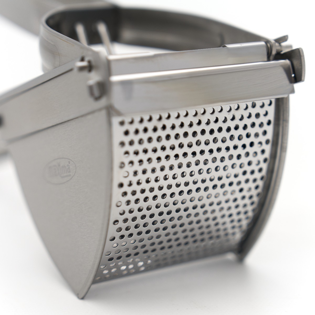 Langlebige manuelle Kartoffelpresse aus rostfreiem Stahl zum Pressen von gekochtem Gemüse in eine glatte, klumpenfreie Konsistenz. Ideal für Kartoffelpüree, Babynahrung oder Gnocchi. Die Kartoffelpresse hat eine Presskammer mit einer feinen Lochplatte und langen Griffen zum Ausdrücken. Einfach zu benutzen und spülmaschinenfest.