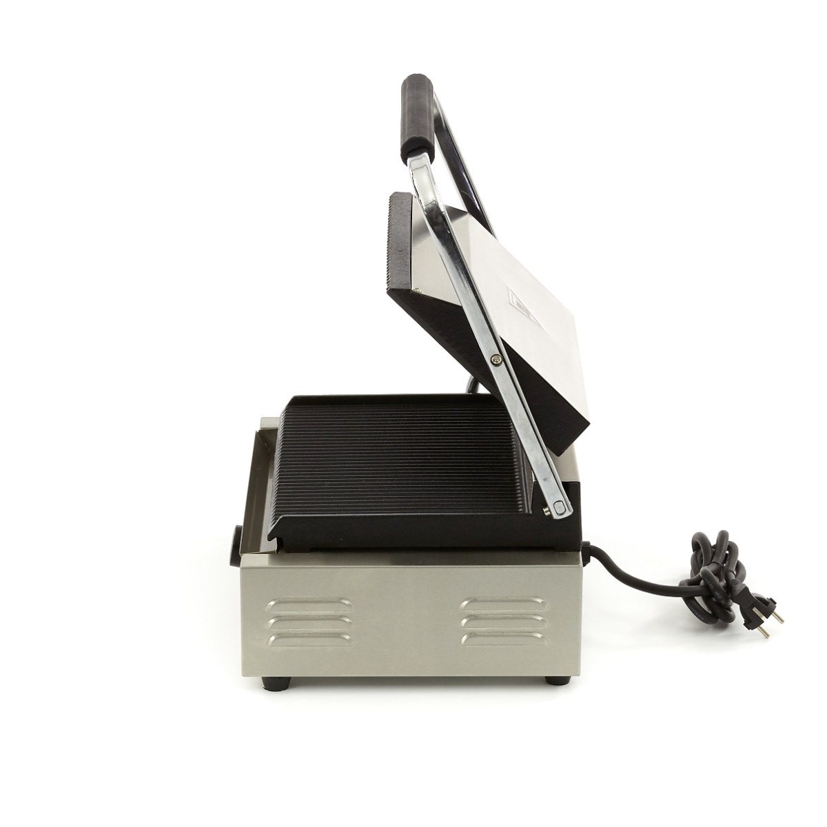 Mit diesem Kontaktgrill mit Edelstahlgehäuse und schweren gusseisernen Rillenbackplatten gelingen köstliche Paninis und große gegrillte Sandwiches. Der Kontaktgrill hat eine praktische Auffangschale für Fett und wird mit einer Reinigungsbürste geliefert, damit Sie den Kontaktgrill leicht reinigen können.