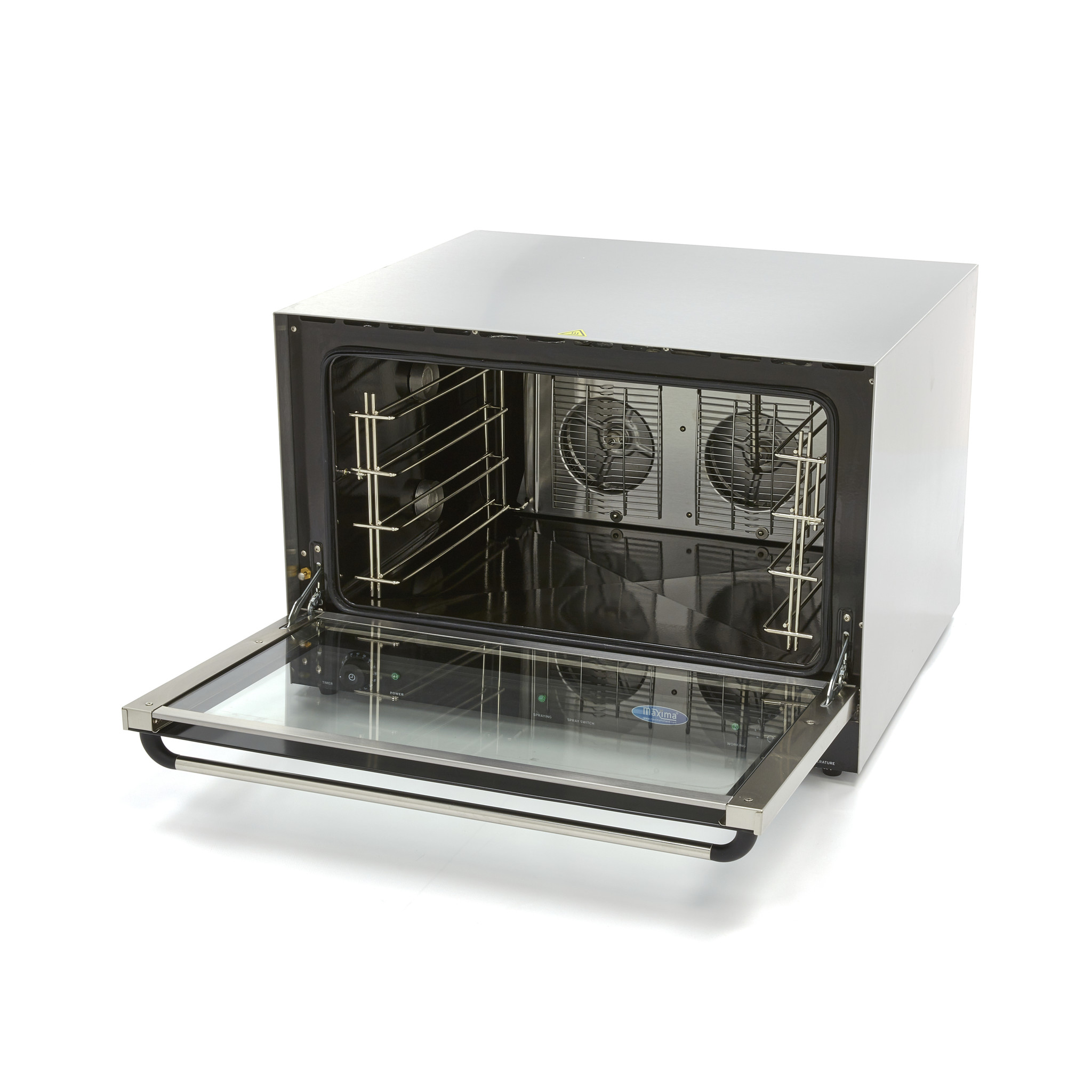 Dieser leistungsstarke Umluftofen ist mit Knöpfen zur Einstellung von Timer und Temperatur ausgestattet und verfügt über eine Dampffunktion. Der Umluftofen ist für vier 60 x 40 cm große Backbleche mit einem Blechabstand von 8 cm geeignet. Er ist ein perfekter Umluftofen zum Backen von Brot, Kochen von leckeren Ofengerichten oder zur Zubereitung von saftigem Fleisch.