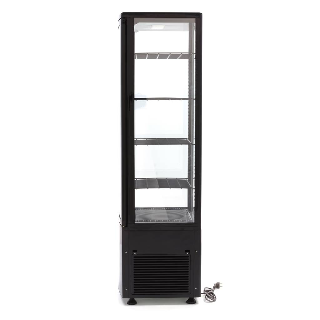 Mit einem Fassungsvermögen von 235 Litern ist dieser professionelle schwarze Ausstellungskühlschrank perfekt zum Kühlen und Ausstellen von Produkten in Gastronomiebetrieben wie Restaurants, Cafés, Bäckereien und Kantinen. Die Temperatur lässt sich einfach über den digitalen Temperaturregler einstellen und er ist mit vier beschichteten Ablagen ausgestattet.