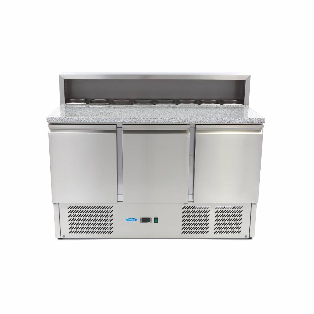Mit diesem Pizzakühlschrank aus Edelstahl mit drei Türen und einer Arbeitsplatte aus Granit können Sie die leckersten Pizzen zubereiten. In einem der acht 1/6-GN-Behälter können Sie alle frischen Zutaten griffbereit aufbewahren und der Kühlbereich darunter bietet mit drei Gittern zusätzlichen Stauraum.