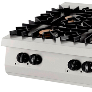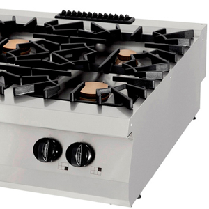 Dieser Premium-Kocher hat 6 Brenner und ist für eine 90 cm tiefe Kochzeile geeignet. Das Gehäuse ist aus rostfreiem Stahl mit abgerundeten Ecken und die Topfträger sind aus Gusseisen gefertigt. Diese soliden Materialien machen diesen Herd ideal für den intensiven täglichen Gebrauch in der Profiküche.