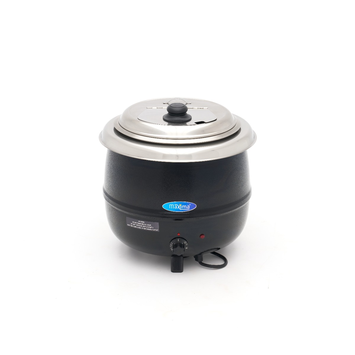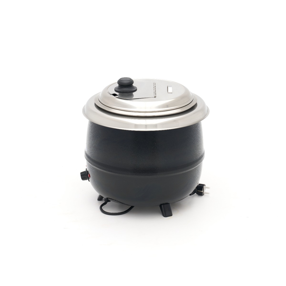 Gebaut für intensive Nutzung mit intelligenter BenutzerfreundlichkeitDer Suppenkessel hat ein robustes, schwarz beschichtetes Aluminiumgehäuse, das Stößen und starker Beanspruchung standhält. Der Innentopf besteht vollständig aus Edelstahl und ist daher leicht zu reinigen. Füllen Sie das Untergestell einfach bis zur angegebenen Höchstgrenze mit Wasser, schließen Sie es an und stellen Sie die gewünschte Temperatur durch Drehen des Drehknopfes auf die gewünschte Einstellung (12 Stufen) ein. Die Kontrollleuchte zeigt an, wenn die Heizung aktiv ist. Sobald die eingestellte Temperatur erreicht ist, setzen Sie den gefüllten Innentopf wieder ein. Dank des Bain-Marie-Systems bleibt Ihre Suppe perfekt warm, ohne dass die Gefahr des Anbrennens besteht.