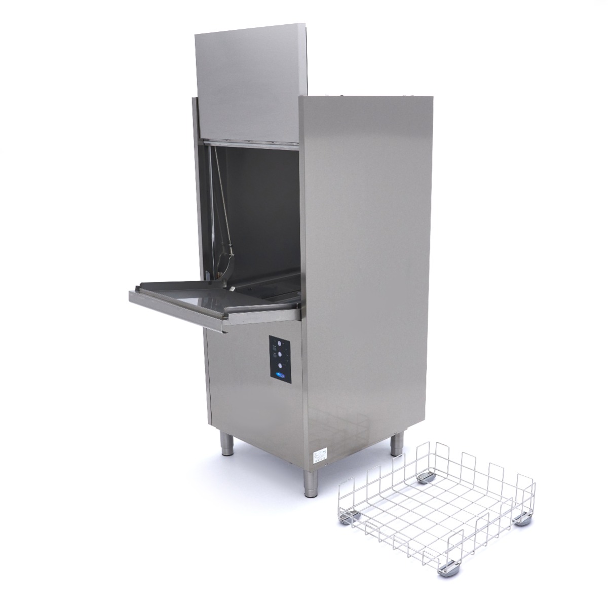 Inklusive Drahtkorb aus EdelstahlDie Inbetriebnahme dieses professionellen Geräts ist sehr einfach. Über das Bedienfeld, das nach IPX4 geschützt ist, so dass kein Wasser hinter die Tasten gelangen kann, schalten Sie den Geschirrspüler einfach ein, und das Wasser wird automatisch eingefüllt und erhitzt. Mit der zweiten Taste können Sie das Spülprogramm einstellen. Die Töpfe und Pfannen werden bei einer Temperatur von 60°C gewaschen und anschließend mit 80°C heißem Wasser gespült, so dass das Geschirr durch Verdunstung schnell wieder trocken ist. Die Wasch- und Klarspültemperatur ist einstellbar. Die Spülmaschine wird mit einem 56 x 63 cm großen Korb aus rostfreiem Stahl sowie einem Zuleitungsschlauch zum Anschluss der Spülmaschine an die Wasserversorgung und einem Abflussschlauch geliefert.
