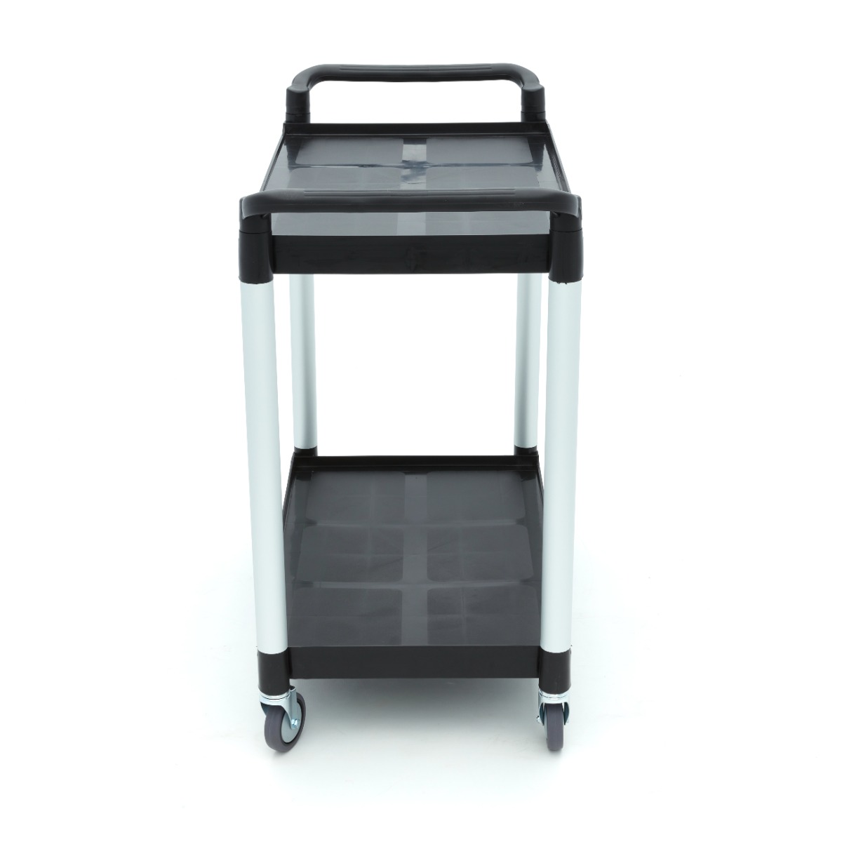 Dieser robuste Servierwagen hat eine Aluminiumkonstruktion und zwei Kunststoffböden, die bis zu 50 kg pro Boden tragen können. Der Wagen hat vier Räder, von denen zwei gebremst sind. Die Beine sind glatt ohne scharfe Kanten und lassen sich leicht zusammenbauen. Die Kunststoffböden sind leicht zu reinigen.