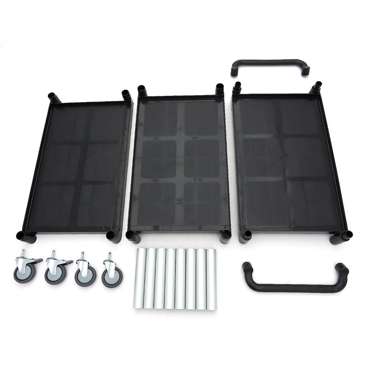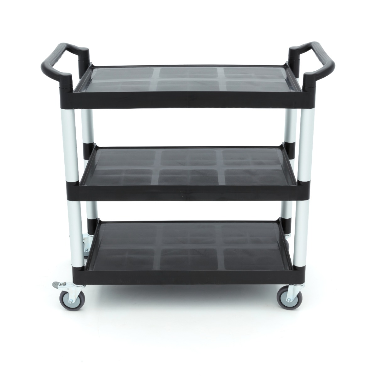 Dieser Servierwagen erspart Ihnen eine Menge Lauferei und Heben, da Sie den Servierwagen die Arbeit machen lassen. Er ist ideal zum Transportieren und Servieren von Mahlzeiten. Der Servierwagen ist auch eine hervorragende Hilfe beim Abräumen von schmutzigem Geschirr in der Küche. Dieser professionelle Servierwagen ist mit drei Kunststoffböden ausgestattet.