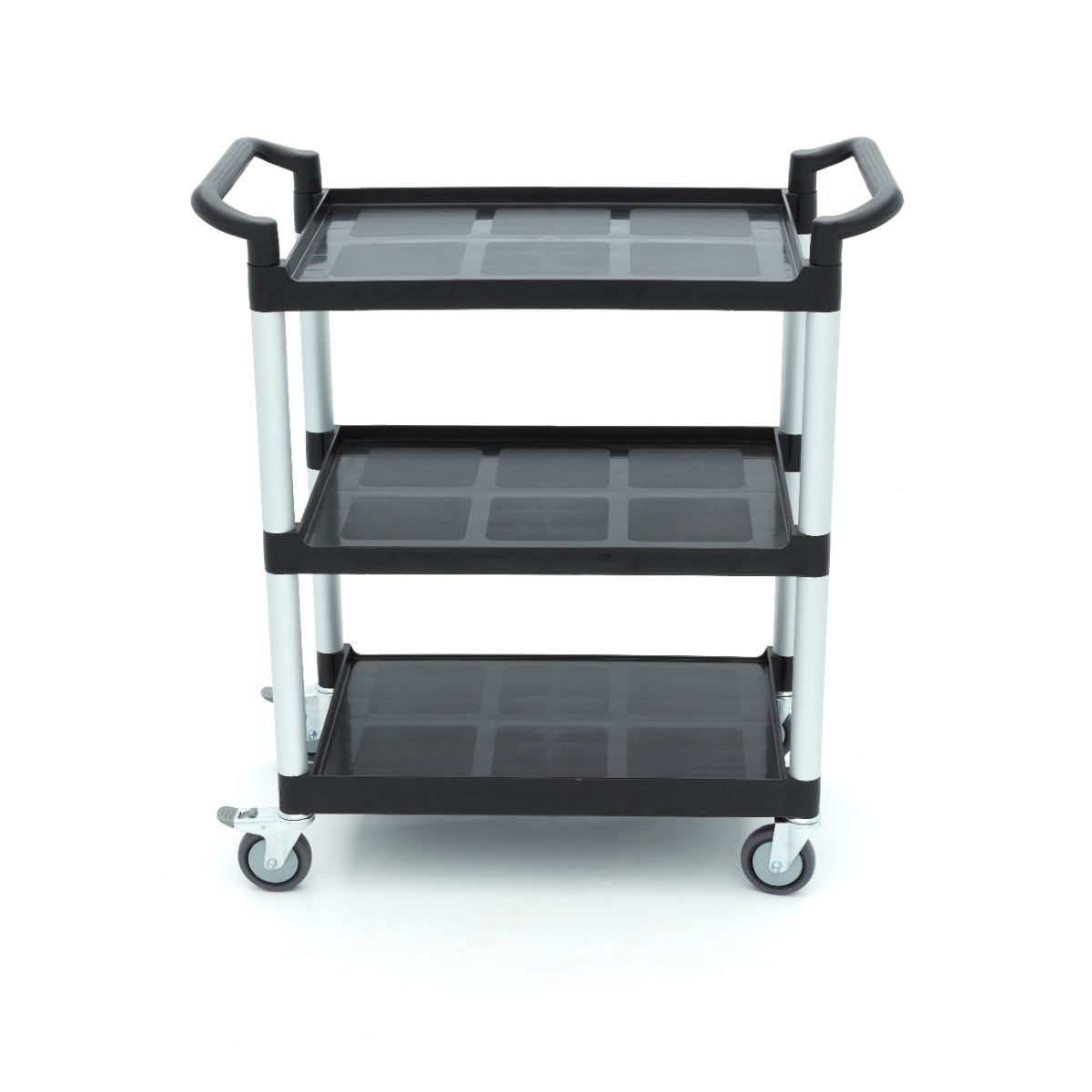 Dieser robuste Servierwagen hat eine Aluminiumkonstruktion und drei Kunststoffböden, die bis zu 50 kg pro Boden tragen können. Der Wagen hat vier Räder, von denen zwei gebremst sind. Die Beine sind glatt, ohne scharfe Kanten und leicht zu montieren, und die Kunststoffböden sind leicht zu reinigen.
