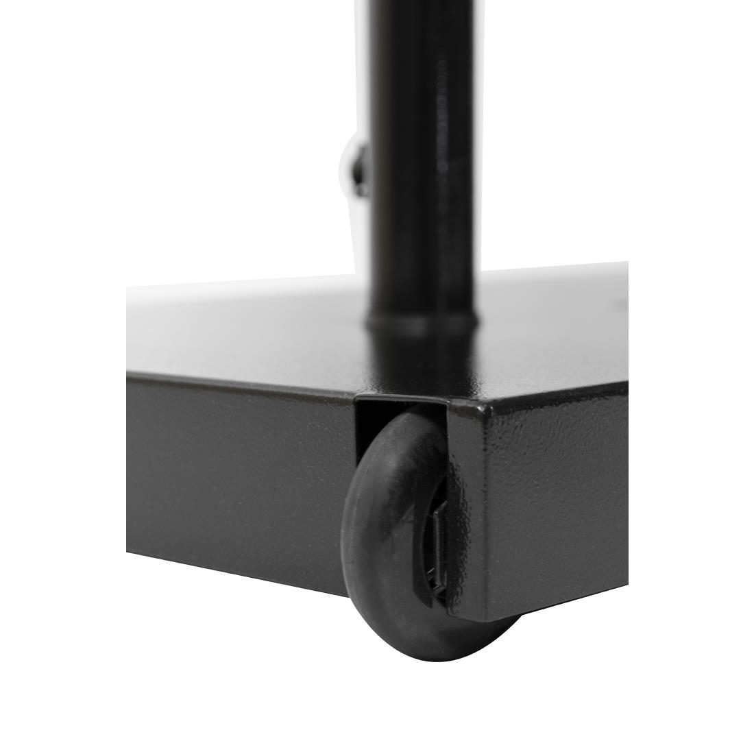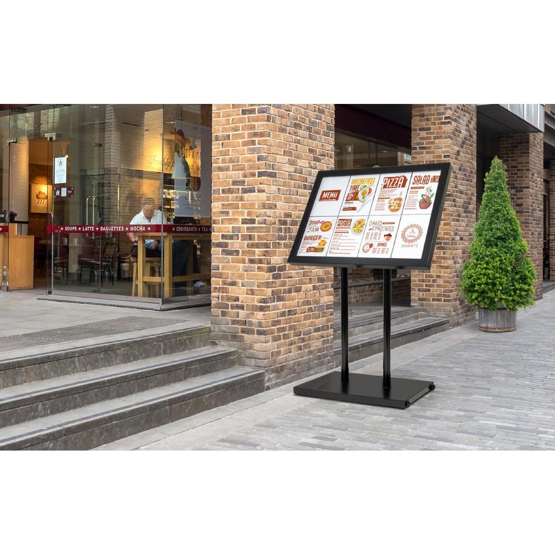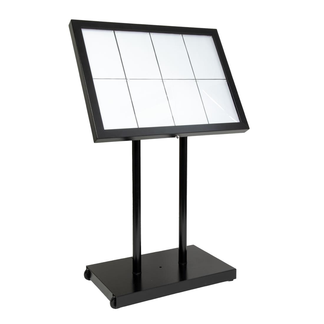 Ein LED-Informationsanzeigenset von Securit in schwarz. Wetterbeständiger, beschichteter Stahl mit weißen LED's. Hoch- oder Querformat. Wandmontage ist auch möglich. Anzeige von 4x A4 Seiten. Geliefert mit Fuß, fünf Meter Kabel und Stecker. Kompatibel mit Batterienset DL182 (separat erhältlich).